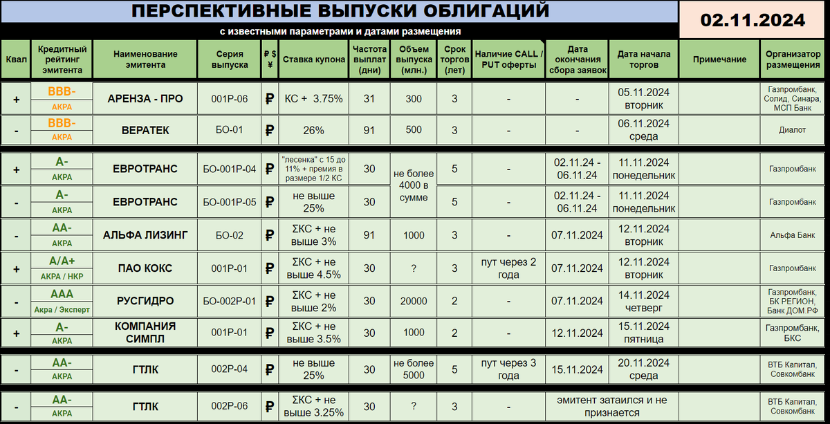 ОБЛИГАЦИОННЫЙ ВЕСТНИК 0️⃣2️⃣🔸1️⃣1️⃣🔸2️⃣0️⃣2️⃣4️⃣ 🥱 Добрый вечер, друзья! Польза вестника сегодня околонулевая - новостной фон ушел на выходные досрочно. И правда, грешно по 6 дней подряд трудиться :) Потихоньку собираюсь и я, поэтому пара новостных строк, статистика попозже... и спать! :) ---------- 🆕 НОВЫЕ РАЗМЕЩЕНИЯ / АНОНСЫ: 🍁 Анонсами нас вчера перекормили, сегодня остались лишь заявления на регистрацию. Пожали их эмитенты: МФК Т-ФИНАНС (🅰️, 001Р-02), БРУСНИКА ( 🅰️➖, 002Р-03), РОСНЕФТЬ (🅰️🅰️🅰️, 004Р-03), РУСГИДРО (🅰️🅰️🅰️, БО-002Р-01). Прошел стадию регистрации выпуск эмитента СИБАВТОТРАНС (🅱️🅱️➖, 001Р-04) ---------- 📶 РЕЙТИНГИ: 🧑🎓 ЭКСПЕРТ РА: 🆕 НОВОСИБИРСКАВТОДОР $RU000A108UJ6 получил новый кредитный рейтинг на уровне 🅱️🅱️🅱️ и стабильный прогноз. При этом у компании также имеется рейтинг 🅰️➖ от агентства НКР, славящегося своей лояльностью к эмитентам. А справедливая оценка, надо полагать, где-то посередине :) ---------- 💸 КУПОНЫ: 🍁 МФК САММИТ по