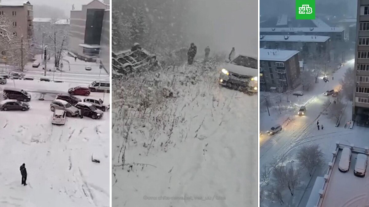 [ Смотреть видео на сайте НТВ ] Мощные снегопады обрушились на Бурятию и Забайкалье. В Бурятии за сутки выпала четверть месячной нормы осадков. Такие сильные снегопады стали неожиданностью для жителей региона, как и в соседнем Забайкальском крае. Многие автолюбители не успели поменять резину, так что количество аварий на дорогах возросло в разы. На федеральной трассе возле города Бабушкин большегруз встал поперек дороги, перекрыв движение. В городах легковушки дрифтовали на дорогах. Жители были вынуждены добираться на работу по колено в снегу. [ Смотреть видео на сайте НТВ ]