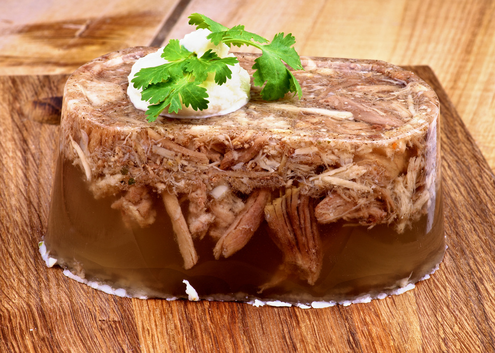 - Итальянский холодец «Aspic». Ингредиенты: говядина — 500 г, курица — 500 г, красное вино — 200 мл, желатин — 20 г, овощи — по вкусу. Мясо варят в воде 4–5 часов на медленном огне. Добавляют овощи за 1 час до готовности. Желатин разводят в вине, добавляют в бульон. Мясо нарезают, выкладывают в формы, заливают бульоном и оставляют в холодильнике.