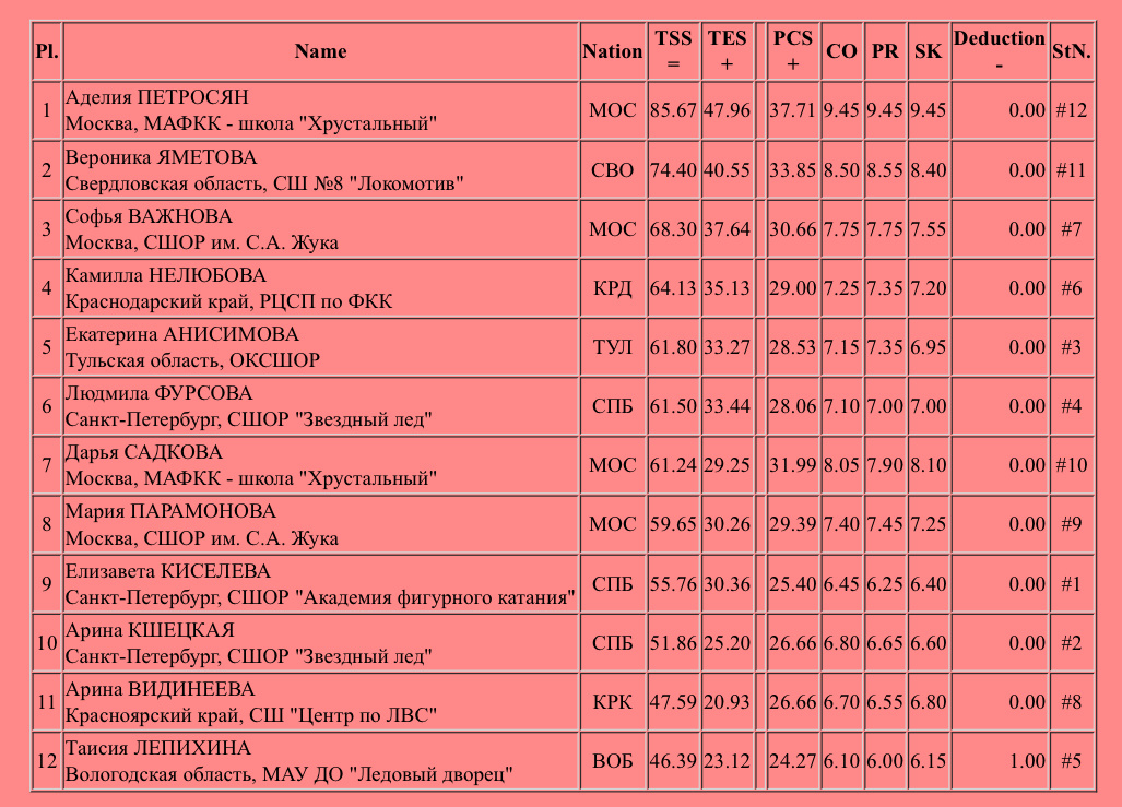 Очень хорошо начала: 3Lo, 2A, а вот на каскад ехала с опаской и он не получился 1Lz+3T… Как будто не оттолкнулась на лутце… Очень жаль. 61.24, 7 место. Надеюсь, реабилитируются в ПП.
