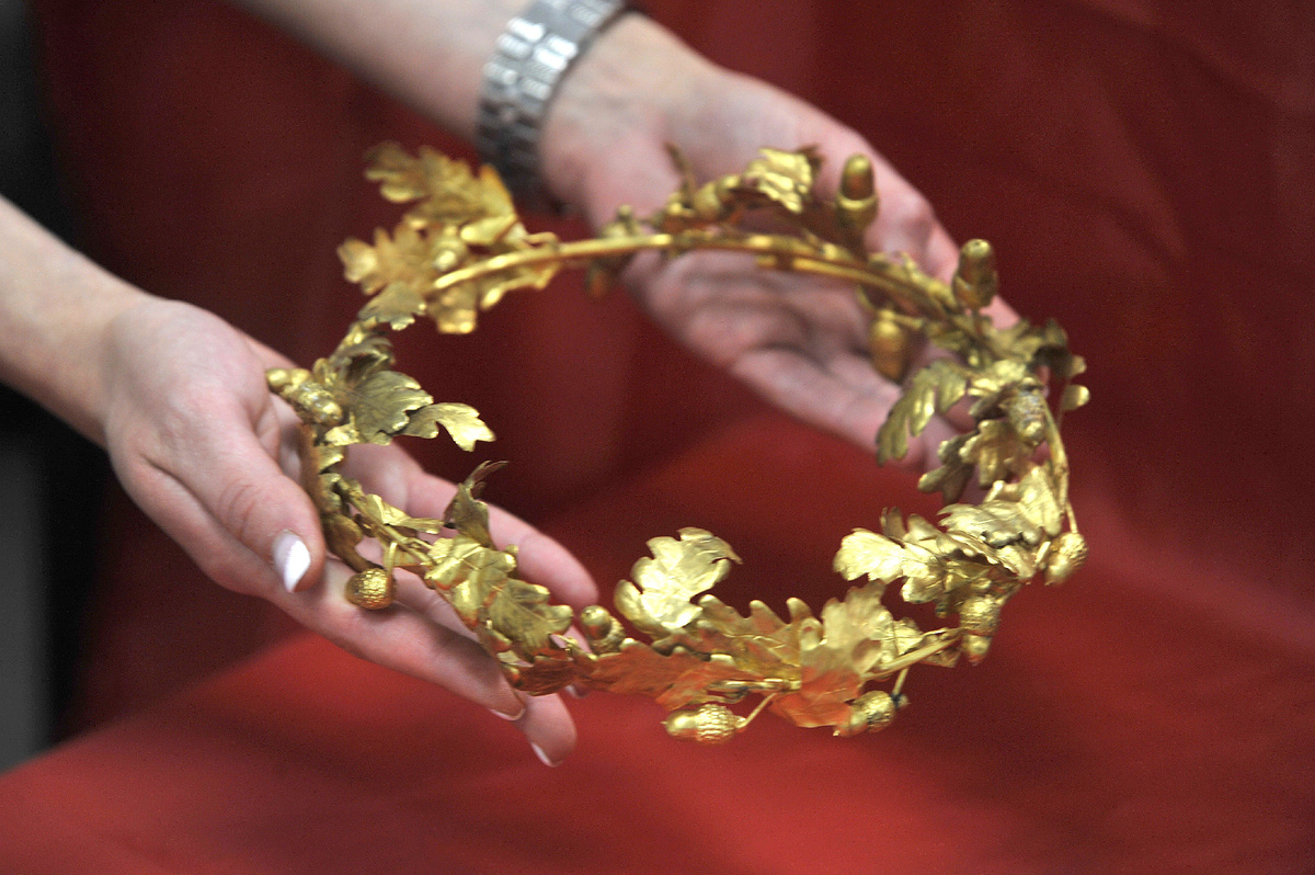 Корона (от лат. corona — венец, венок) – символ власти, как земной, светской, так и духовной, божественной, а также знак могущества, достоинства, избранности, славы и победы. Все прекрасно представляют себе корону в виде головного убора, состоящего из обруча и зубцов на нем, золотых, конечно же. Корни короны – в Древней Греции, в лавровых венках, которые сначала приносились в дар богам. Затем венки стали делать из золота; их могли вручать за воинские заслуги или победителям спортивных соревнований, их носили участники религиозных и свадебных обрядов. Кроме венка у греков была диадема, изначально представлявшая собой богато украшенную повязку на голову. Венок и диадема стали прародителями короны. До нашего времени сохранились золотые венки из золотых лавровых и дубовых листьев, например, хранящийся в Грегорианском археологическом музее золотой венок из дубовых листьев середины IV века до н.э. из древней Этрурии, найденный в женском погребении в Вульчи (город-государство этрусков, разруш