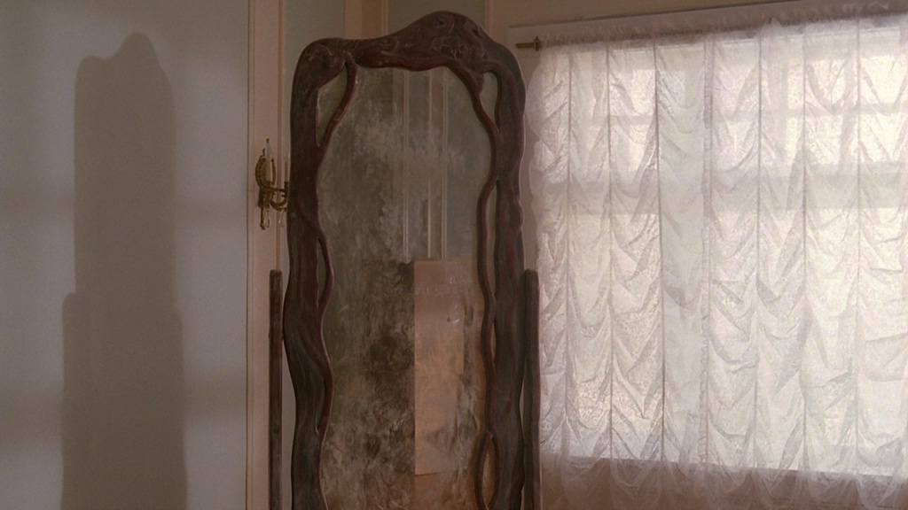 Разумное мистическое зеркало в роли антагониста - это, конечно, на тот момент было относительно свежо ("Окулус" и "Зеркала" сняли значительно позже). Но фильм в наши дни подкупает не этим, а острым привкусом 90-х, когда над жанровыми штампами уже потихоньку начали иронизировать. Про Меган даже говорят: "А чё она одевается, будто главная героиня ужастика?" Есть и более конкретная отсылка к классике - а конкретно к "Кэрри". До "Крика" ещё 6 лет - постмодернизм подкрадывается незаметно...