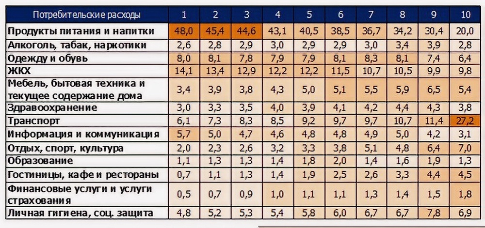То есть будет повышаться пока не остановится потребление. И апеллируют в ЦБ именно к богатым. Потому что бедные и не могут больше платить, з/п им никто не повышает, они могут больше брать кредитов, что собственно и делают, для того, чтобы купить ту же обязательную корзину для выживания. И вот тут становится интересно, т.к. у нас пропасть между доходами бедных и богатых, одна из самых глубоких в мире. Одинаково ли потребление у гражданина с зарплатой в 45 тысяч рублей в месяц и у гражданина с зарплатой в миллион рублей в месяц? То есть, если мы окунёмся в структуру расходов, то увидим (см. ниже)