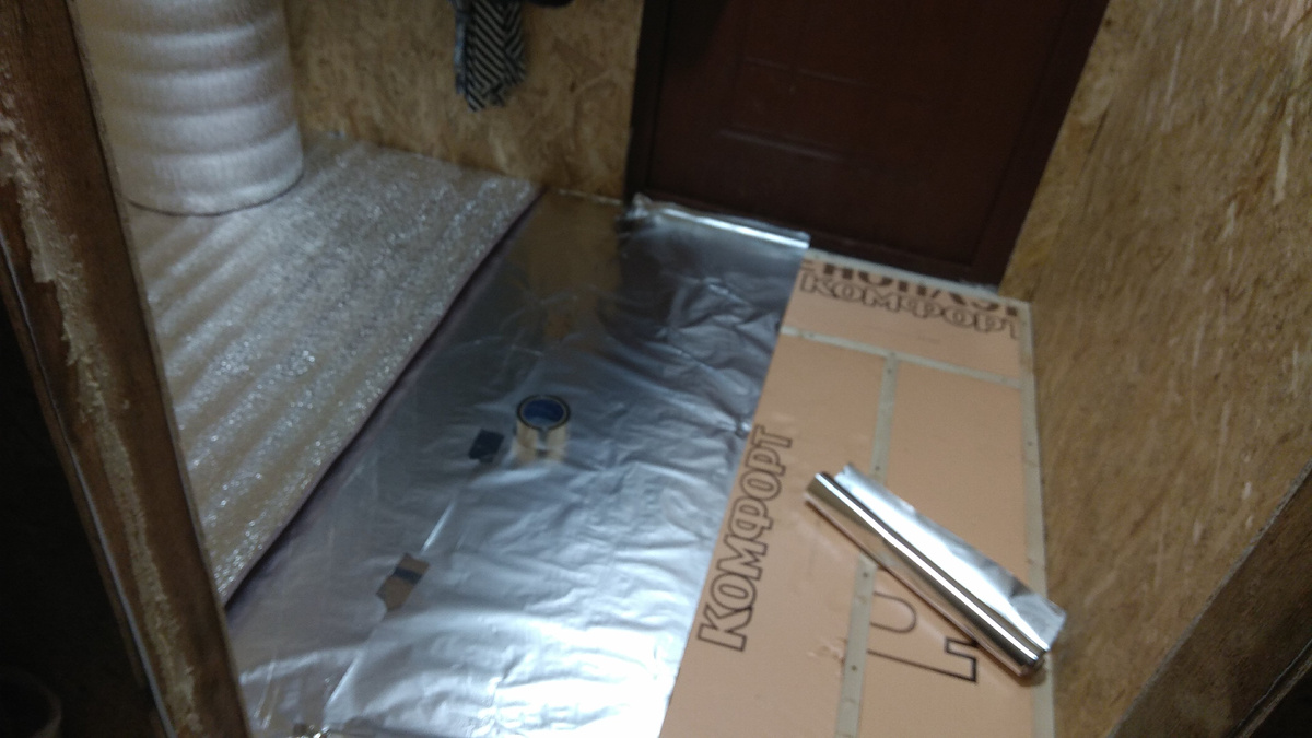 Начало утепления маленькой бытовки положено ещё год назад, и вот наконец-то руки дошли для продолжения этой эпопеи. Стены и потолок уже обшиты ОСБ щитами, остался пол... Самое наверное не понятное для меня. Поскольку вся бытовка была построена на полу, то вопрос с утеплением был открытым до последнего момента, ибо не было понимания как это сделать с минимальной потерей общей высоты. Решение пришло неожиданно. Оно конечно не совсем стандартное, но оно должно работать. Довольно простой вид пирога: Вероятно можно было обойтись и без фольги, но зная горючесть пеноплекса, а теплый пол, хоть и инфракрасный, для меня загадка по надёжности. Ну хуже точно не будет. По проекту и плану был теплый пол, разделенный на две части: в тамбуре и в виде дорожки непосредственно в комнате. Изучение подключения заняло больше времени, чем сама укладка и подключение. Но это только начало, как экспериментальный вариант, для понимания техпроцесса. Впереди ещё укладка пирога в комнате.