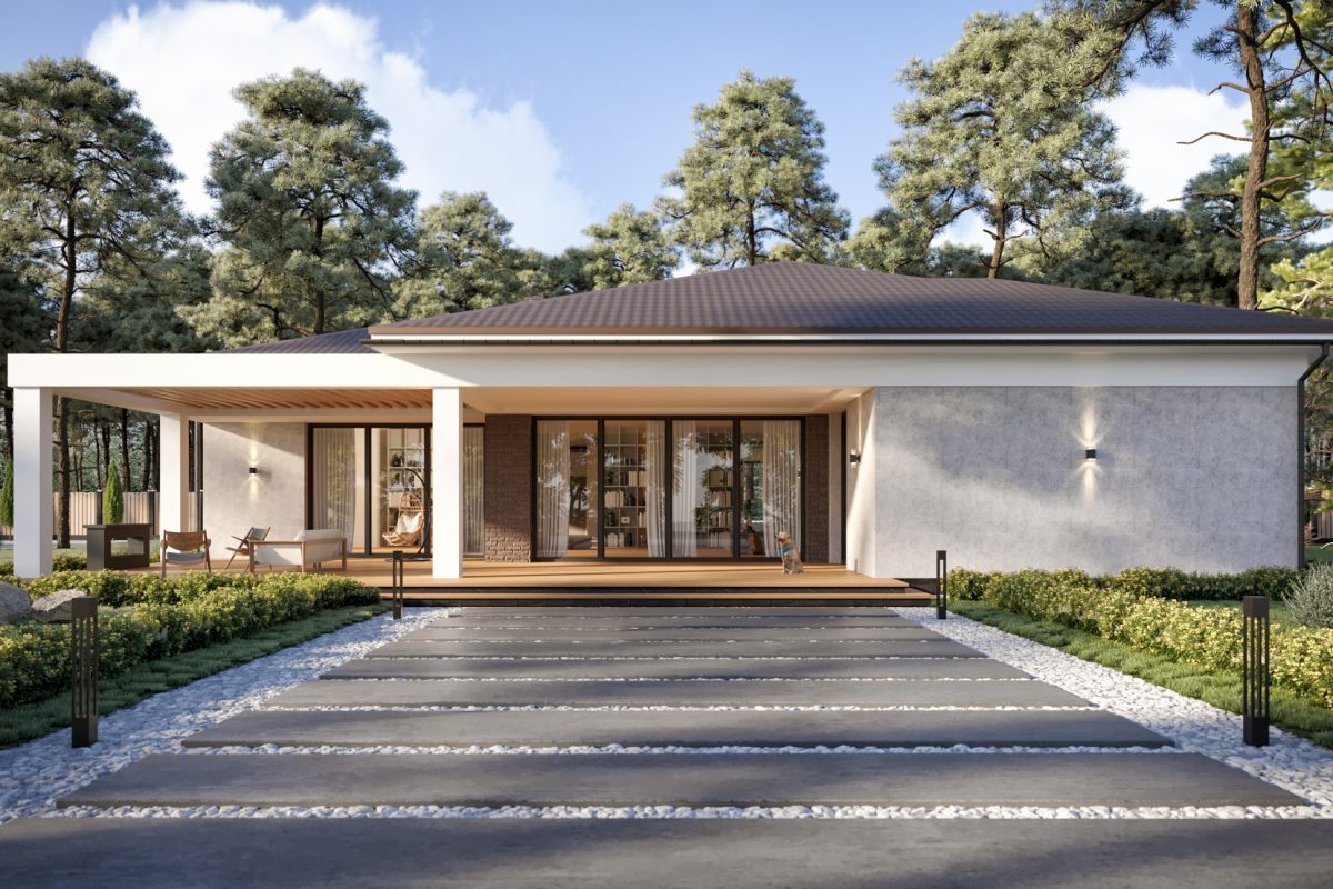 Представляем вашему вниманию индивидуальный одноэтажный жилой дом общей площадью 376 кв.м.* Предназначен для комфортного проживания семьи с четырьмя детьми. Габариты дома в осях 19,82 м х 29,7 м.Т Три санузла, техническое помещение, кладовая комната, четыре детские спальни и одна мастер-спальня с собственным санузлом и гардеробной, гараж на две машины спортзал с отдельным выходом на собственную террасу и огромная гардеробная при входе. Большое удобное крыльцо и комфортная терраса. Состав помещений: • тамбур — 7,80 кв.м • гараж — 46.45 кв.м • ИТП — 7.14 кв.м • санузел — 5.10 кв.м • холл — 30.01 кв.м • гардеробная — 16.77 кв.м • спальня 1 — 14.94 кв.м • спальня 2 — 15.41 кв.м • санузел — 9.97 кв.м • спальня 3 — 14.15 кв.м • спальня 4 — 15.82 кв.м • гостиная — 70.67 кв.м • кухня-столовая — 44.14 кв.м • кладовая — 10.10 кв.м • мастер спальня — 28.61 кв.м • гардеробная — 10.91 кв.м • санузел — 11.72 кв.м • спортзал — 17.92 кв.м ИТОГ — 376.83 (дополнительно крыльцо 14.26 кв.м, терраса 96.69