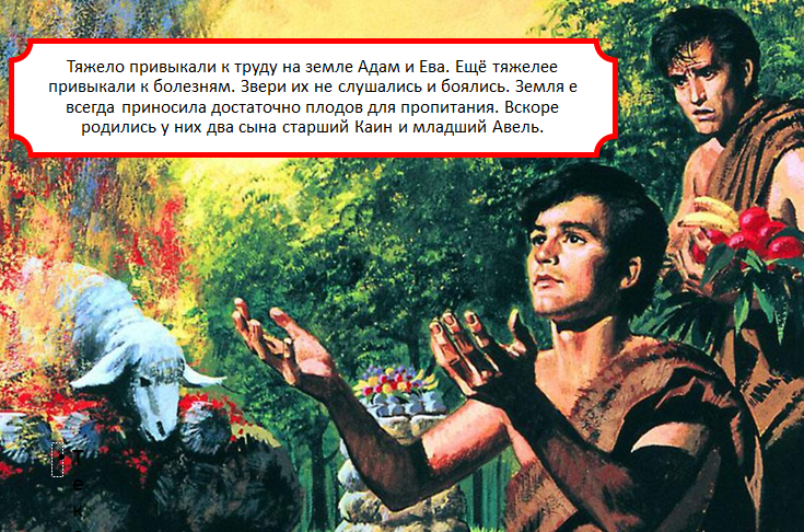 По данной теме есть презентация с викториной для воскресной школы. Желающим скину на почту. Тяжело привыкали к труду на земле Адам и Ева. Ещё тяжелее привыкали к болезням. Звери их не слушались и боялись. Земля е всегда приносила достаточно плодов для пропитания. Вскоре родились у них два сына старший Каин и младший Авель. Каин занимался хлебопашеством, а младший, Авель, пас стадо. Однажды братья захотели, что-нибудь принести в жертву Богу и зажгли два костра. Каин пожертвовал костру хлебных зёрен, Авель пожертвовал ягнёнка. Авель отдавал свой дар с любовью и молитвой и поэтому дым от его костра поднимался вверх. Дым от костра Каина расстилался по земле так как он отдавал дар без молитвы и неохотно. Каину стало обидно, что Бог слышит искреннюю молитву брата. И вместо того, чтобы усерднее молиться Богу, Каин от зависти и злости решается убить Авеля. После такого тяжкого греха Бог дал шанс раскаяться Каину в содеянном, но он только дерзил и хамил в ответ. За вранье, убийство и дерзость Б