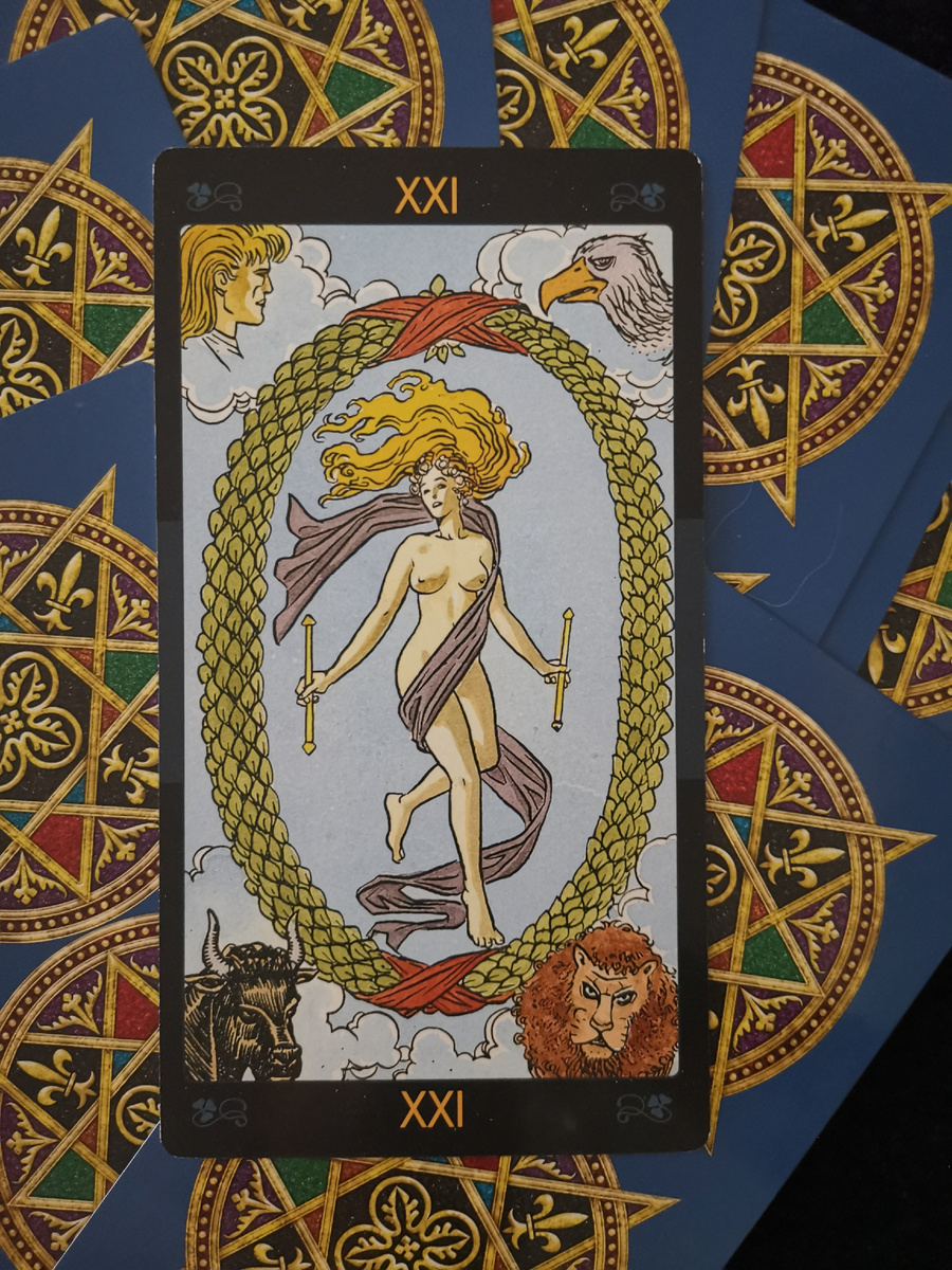 Это успех, которым увенчались ваши усилия. Достижение, обретение, гармония. На карте изображена исполненная радости танцовщица, свободная, прекрасная, парит в космическом пространстве. Этот образ полного осуществления можно найти в разных культурах мира. Иногда сходным способом изображают индуистского бога Шиву и богиню Кали. Золотая Заря поместила эту карту на последнем пути Древа Жизни, ведущим от Йесод к Малкут, из лунной сферы в земную. Таким образом, он оказывается как бы низшим, максимально далеким от Духа. И в целом, его интерпретации разнятся даже в рамках эзотерической традиции. Я предпочитаю вариант Элифаса Леви, который соотносит его не с низшим путём, а с высшей сефирой, Кетер, с чистым светом, содержащим в себе всё бытие. В танцовщице можно увидеть символ преодоления ограничений - точно так же, как настоящие танцовщицы следуют самодисциплине для, пусть и кажущегося, освобождения тела от власти гравитации. "Мир" не просто преодолевает препятствия, а превосходит их, станови