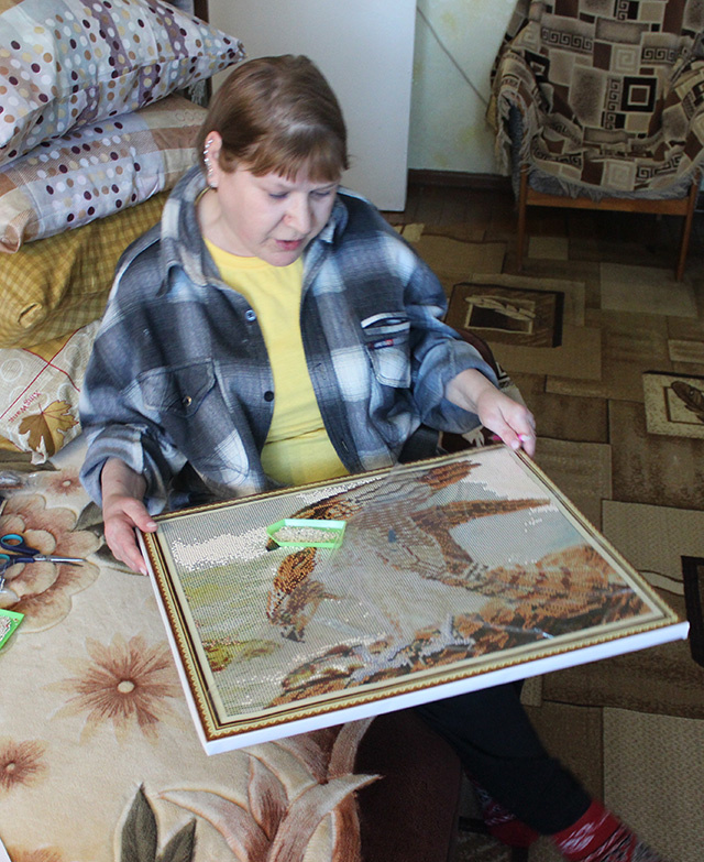 Там я и узнала о том, что Татьяна – человеком с ограниченными возможностями здоровья, считается местной умелицей, которая с большим вдохновением и любовью работает над созданием картин из алмазной мозаики, пользующихся популярностью у жителей Печоры.
