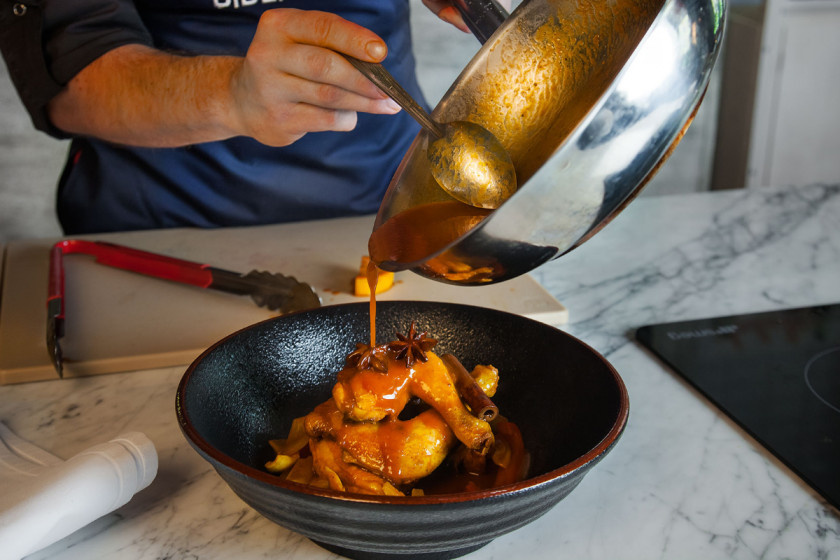 Пряные нотки ― это именно то, что нужно в Петербурге в холодное время года. При этом аппетитного цыпленка очень просто приготовить! Делимся пошаговым рецептом. 1. Тушку цыпленка разделать на 4 части. 2. Смешать все ингредиенты для маринада и мариновать в нем цыпленка не менее 2 часов. 3. Обжарить маринованного цыпленка на растительном масле с обеих сторон до золотистой корочки. 4. Поставить в духовку на 15 минут при температуре 180° С. Достать из духовки и вытащить из сковороды. 5. В той же самой сковороде обжарить мелко нарезанный лук, чеснок, соломку сладкого перца, затем влить белое вино. 6. Немного выпарить и добавить томатную пасту. 7. Слегка пассеровать. Затем добавить сахар, изюм, черный перец, палочки корицы, бадьян и дольки лимона. 8. Потушить до получения однородного соуса и поместить цыпленка в соус и поставить обратно в духовку на 3-5 минут. 9. Выложить цыпленка в глубокую посуду, полить сверху соусом. 10. Декорировать листьями кинзы. Приятного аппетита!