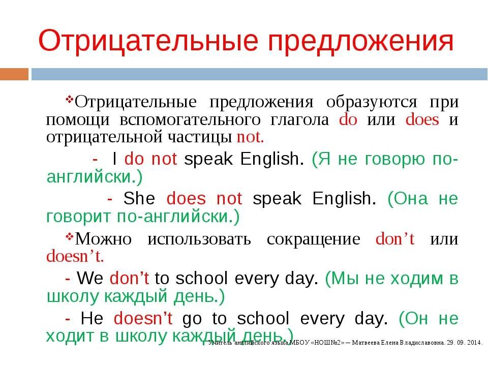 Отрицательные предложения в английском языке образуются с помощью вспомогательных глаголов do и does, а также слова not. Важно понимать, как они используются в различных формах для I/you/we/they и he/she/it.