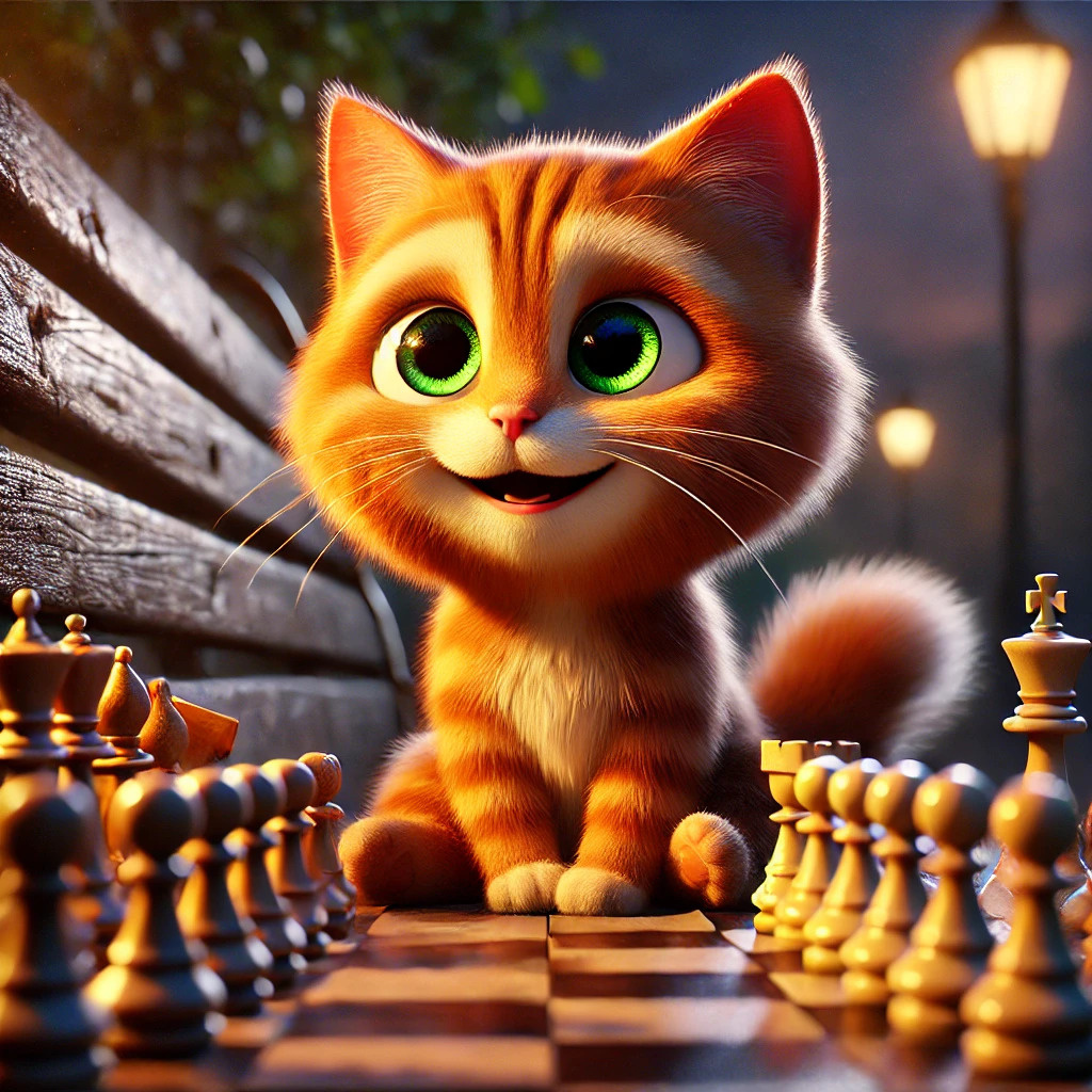 Вечер уже подходил к концу, когда котёнок Мур-Мяу и его подруга Дыся, небольшая серая кошечка с наивными голубыми глазами, решили прогуляться по двору. Друзья бродили по знакомым улочкам, высматривая что-нибудь интересное или необычное. У подъезда на скамейке лежало что-то чёрно-белое с аккуратно выложенными фигурками. Мур-Мяу подошёл ближе, удивлённо разглядывая находку. — Дыся, смотри! Что это такое? — спросил он, подзывая подругу лапой. Дыся, осторожно ступая, приблизилась к лавочке и, нахмурив пушистый лоб, внимательно посмотрела на странный предмет. — Похоже на игру, — сказала она задумчиво. — которая есть у нас дома. Только я забыла как она называется. На доске, четко разделенной на чёрные и белые клетки, стояли небольшие фигурки разных форм и размеров. Там были высокие башенки, стройные фигуры с округлыми головками, миниатюрные лошадки, а в центре возвышались король и королева. Пока они рассматривали доску, из-за угла двора к ним подошёл Хмурый Боб, старый дворовый кот с тёмно-