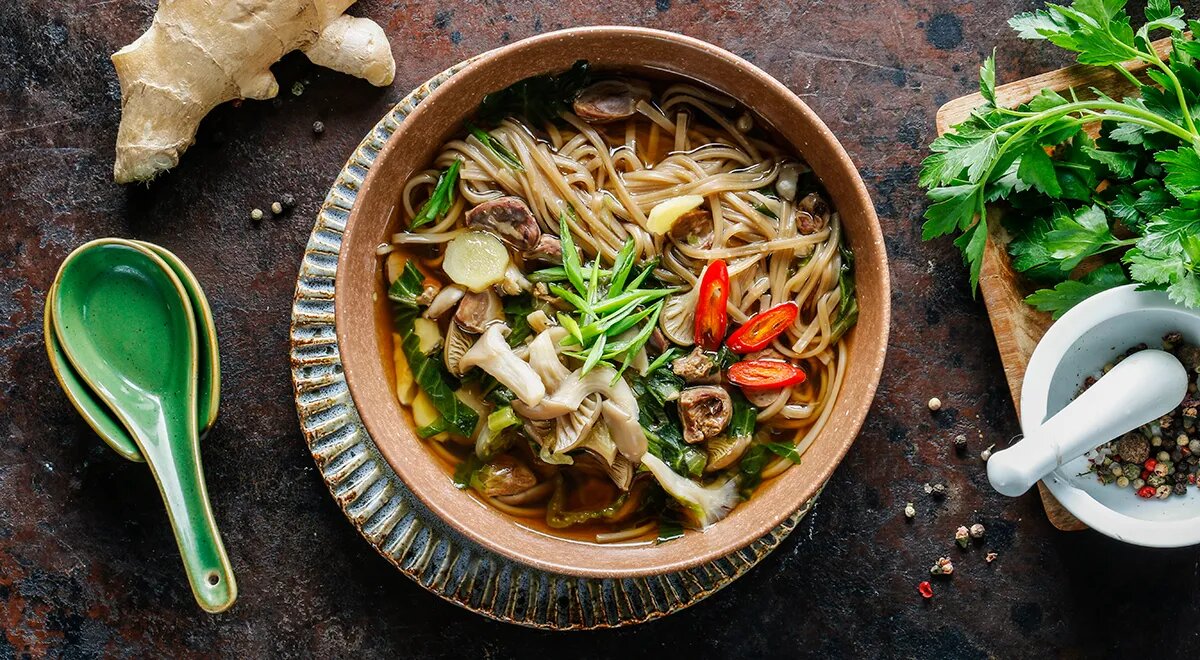 Суп с куриными сердечками – простое и привычное блюдо, которое, вероятно, готовили в вашей семье мама и бабушка. Но почему бы не попробовать взглянуть на него иначе и добавить азиатские акценты? В качестве основы используем гречневую лапшу, которая придаст супу особую сытность и оригинальность. Тщательно промойте куриные сердечки под холодной водой, удаляя сосуды и лишний жир. Разрежьте каждое сердечко пополам и промойте от остатков крови. Переложите сердечки в большую кастрюлю, залейте 1 литром воды и доведите до кипения. Дайте им покипеть 3-4 минуты, затем слейте воду, используя дуршлаг. Протрите кастрюлю бумажным полотенцем, верните в нее сердечки и залейте 2,5 литрами кипятка. Уменьшите огонь до среднего и варите 20 минут. Подготовьте овощи: срежьте корешки у вешенок и разделите грибы на длинные полоски. Пекинскую капусту нарежьте тонкой соломкой. Очистите корень имбиря, проще всего сделать это ложкой, соскребая кожуру. Нарежьте имбирь тонкими кружками. Перец чили и зеленый лук пор