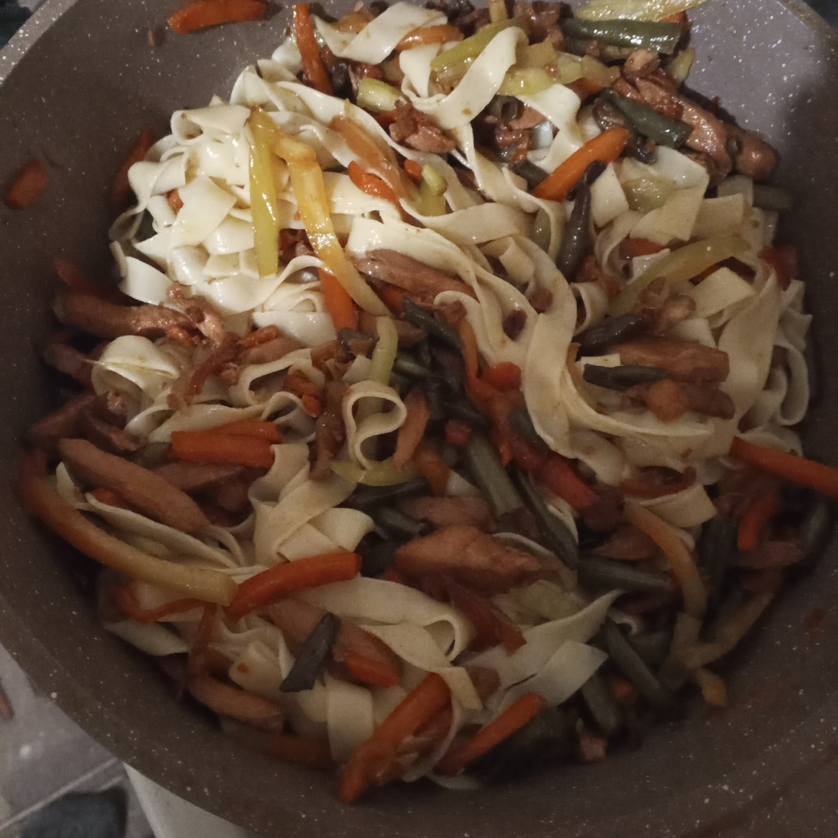 6) Готовые макароны добавляем к овощам и куриной грудкой.