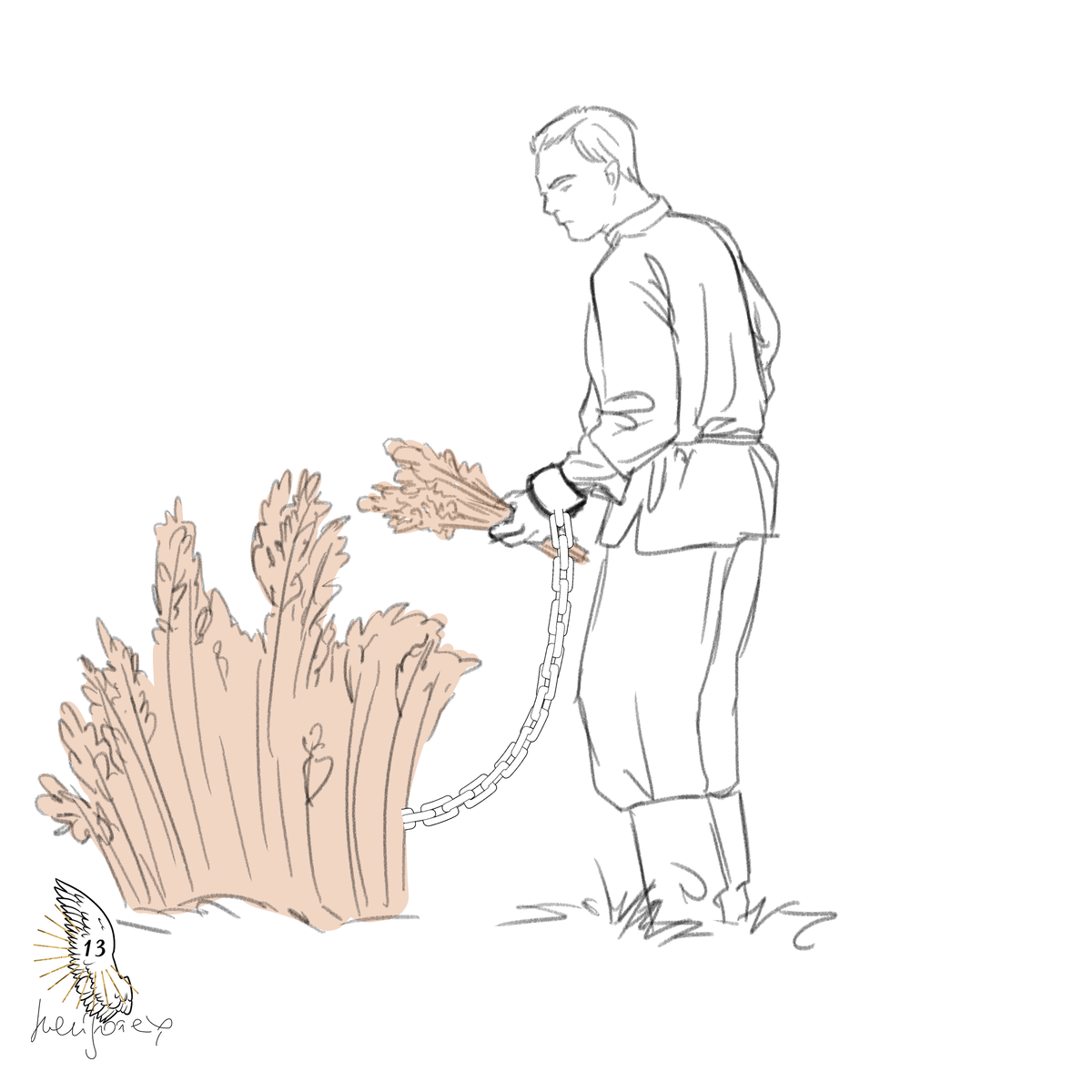 - У него в руках уже не листья… а как наручники что ли… будто его приковали к этому труду.