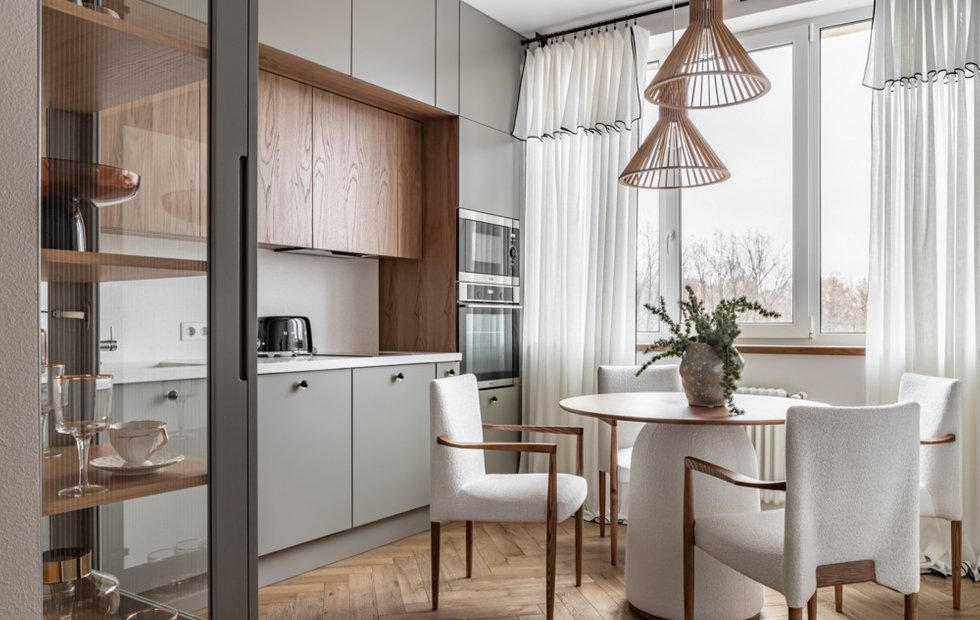 В интерьере использовали много дерева: инженерная доска из дуба, шкафчики в отделке шпоном, обеденная группа из массива и даже светильники из дерева.