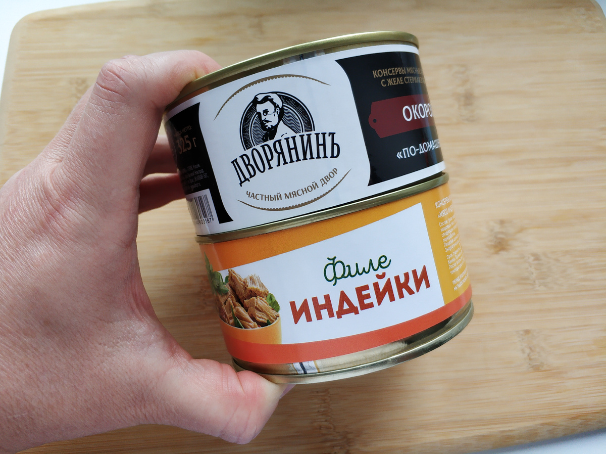 и да, это не тушеное мясо, как обычно, а называется - консервы из мяса индейки стерилизованные В ЖЕЛЕ. Вот так вот... И да, не по ГОСТу, а по ТУ.