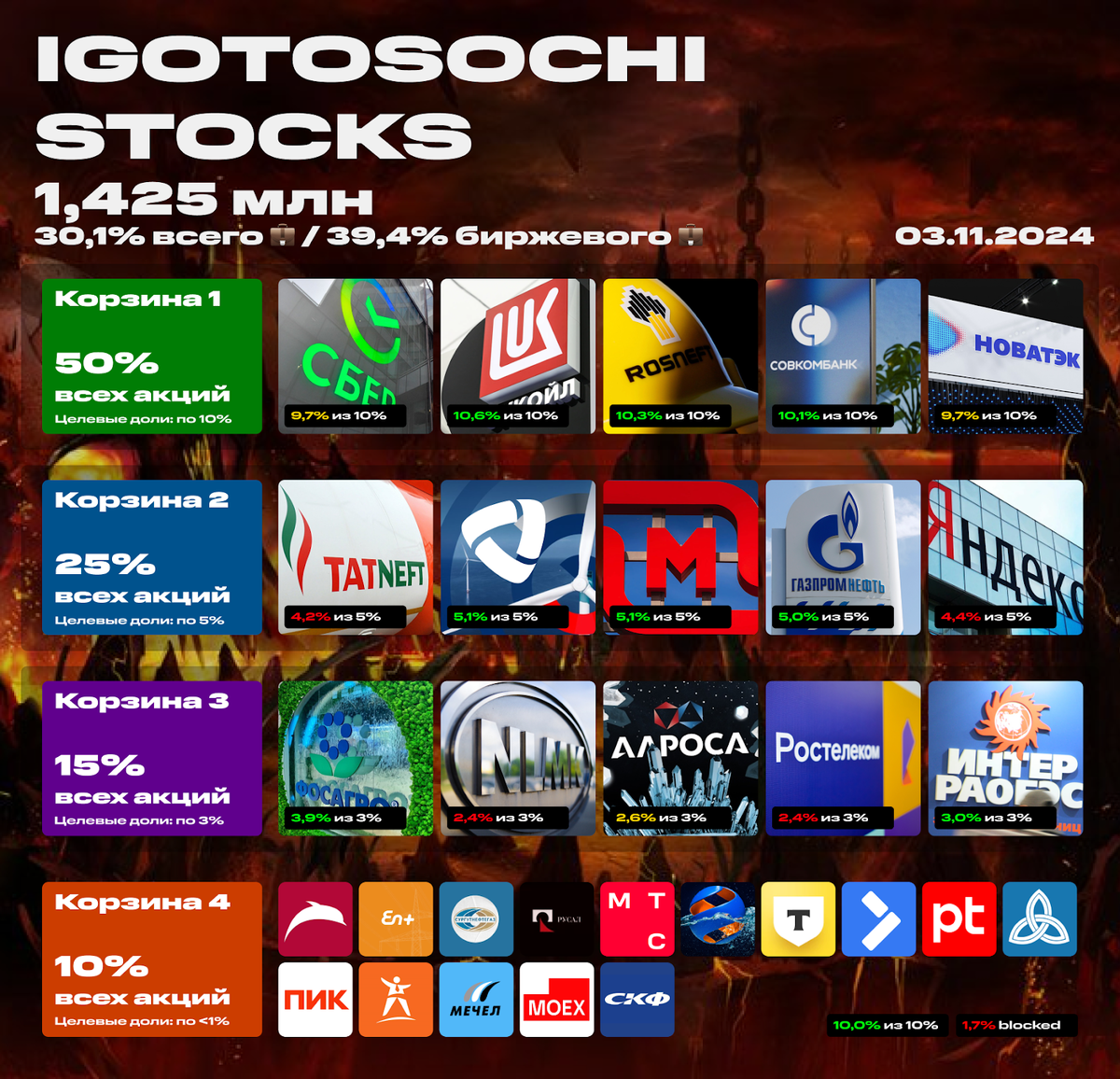 Жёстко октябрь проехался по фондовому рынку, а я продолжаю покупать акции в свой портфель. Посмотрел, как идут успехи с приведением его к целевым значениям. Пока ещё портфель находится на стадии формирования, но картина вырисовывается с каждым разом всё отчётливее. Его размер составляет ровно 1,425 млн рублей. Предыдущий срез был 20 октября. Акции занимают 30,1% от всего портфеля (актуальный отчёт от 1 ноября). Если взять только биржевой (без депозитов), это 39,4%. Целевая доля акций в биржевом портфеле 40%. Целевые значения могут быть достигнуты при размере портфеля акций в 1,5–1,6 млн — уже почти. Потратил на акции около 95 тысяч рублей. Все покупки второй половины октября тут. Кроме акций я покупаю облигации и паи фондов. По плану у меня была покупка акций, которые сильнее отставали от целевых долей: Совкомбанк, Роснефть, Газпром нефть, Магнит и Северсталь. Собственно, их и покупал, на другие покупки бюджета уже не хватило. Все они перешли в зелёную зону. Новая ключевая ставка сильн