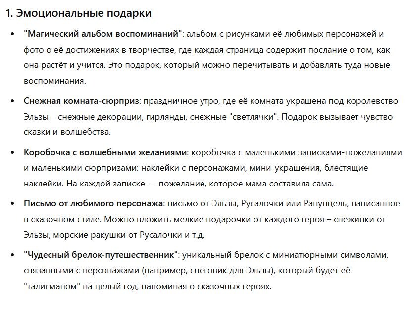 Указываете для кого нужно придумать подарки, интересы этого человека и получаете 25 оригинальных вариантов, которые поразят ваших близких и продемонстрируют вашу любовь и заботу. Представь, что ты – самая любящая в мире [жена/мать/дочь/подруга]. Твоя задача – придумать концепции новогодних подарков для [мужа/дочери/матери/подруги, можно указать возраст]. Эти подарки должны вызвать настоящий вау-эффект, транслировать любовь и заботу о близких. Забудь про традиционные решения, сосредоточься на необычных и неожиданных идеях, которые заставят получателя почувствовать себя по-настоящему особенным. Все подарки должны быть легкими для реализации, но выглядеть так