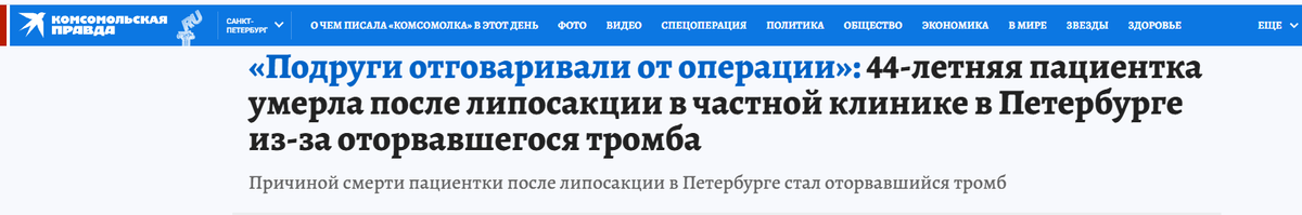 Как говорят эксперты, при липосакции тяжелая эмболия и отрыв тромбов — риски, которые необходимо учитывать, но о которых многие не думают. Ведь кто захочет ложиться под нож, если честно объяснить все страшные последствия? Ведь мы живем в эпоху, когда социальные сети навязывают стандарты: всегда будь молодым, стройным и идеальным.