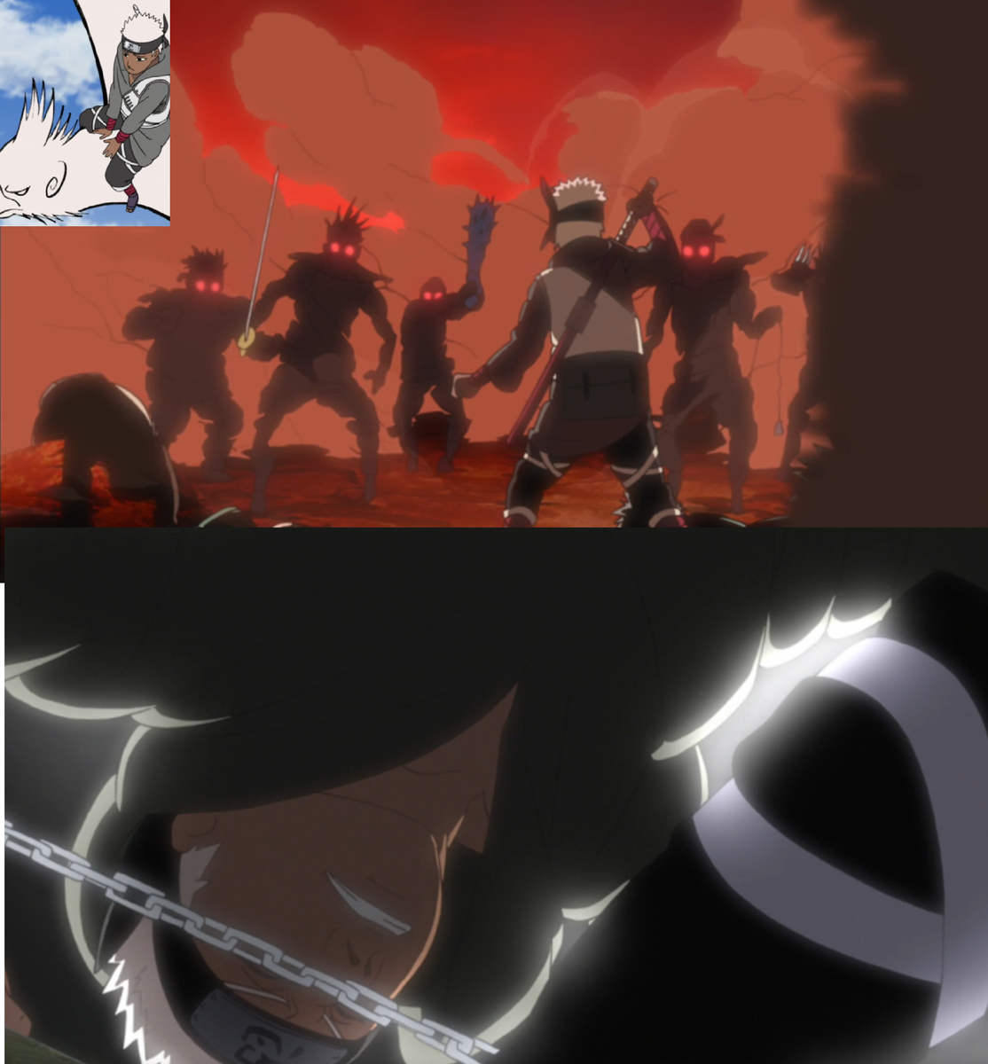 Вот и сейчас он представляет себе дальнейшие события, где враги представлены некими абстрактными уродливыми сущностями (вероятно, так он представляет воскрешённых шиноби), а так же переживает, что его схватят и будут пытать.