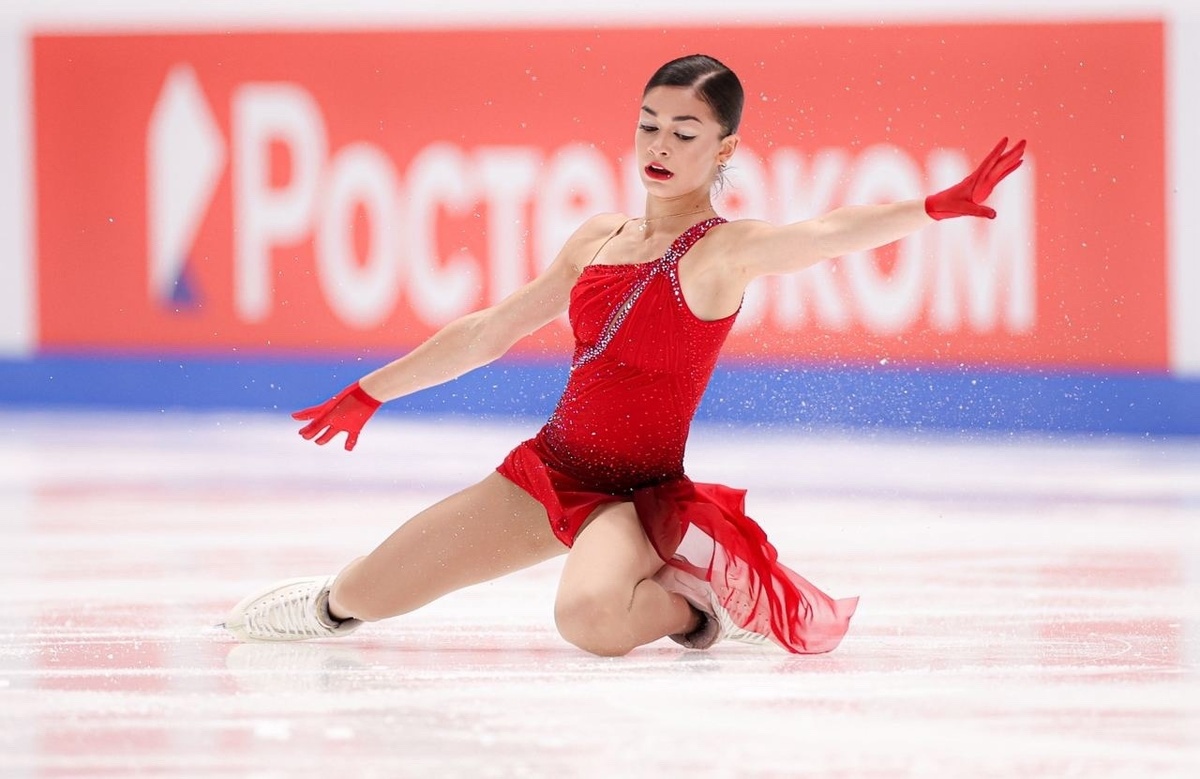 Аделия Петросян. Школа Этери Тутберидзе. Здорово, несмотря на бабочку! Тройной аксель - небольшое виляние при выезде. Четверной тулуп - бабочка. И, как мне кажется, немного издевательски из-за слов Даниила Глейхенгауза о новых тренировках из-за бабочек. Четверной тулуп, вторая попытка - чисто. 3Л - степ аут. Фигуристка осталась без каскада. Остальные два каскада фигуристка исполнила чисто.