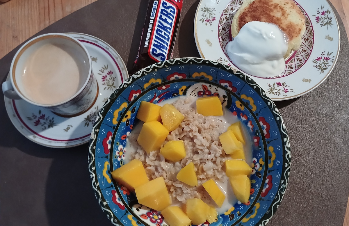 Экономное меню за 233 руб в день Завтракаем овсяной кашей с манго. Плюс домашние сырники со сметаной. И сникерс к кофе положила, но не съела с утра. Обед - из остатков в холодильнике. Оставалось немного киноа. Сделала типа яйца-пашот с крупой, плюс огурец и снежный краб. Вкуснейший обед получился 👍 и уже после обеда кофе с тем же самым сникерсом. Просто герой дня сегодня😀 После обеда наводила порядок в аптечке. Выкинула кое-что из просроченных препаратов. Написала сроки годности маркером на бутылочках и таблетках, чтобы каждый раз не искать. Это очень удобно, давно такое практикую. Записала в список купить антигистаминные препараты. На ужин снова маринованное куриное филе на гриле. Своим варила рис на гарнир, а у меня только зеленый салат. Вот это все я не съела, половина на завтра еще осталась. Меню год назад У меня в морозилке была бутылка кефира. Сделала из нее творожный сыр. И осталась сыворотка, на которой я сразу же напекла тонких блинчиков. Рецепты и творожного сыра из кеф