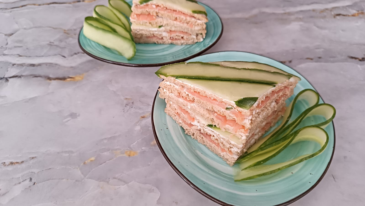 соль и сода -- по две щепотки Для теста всё смешать и дать настояться, у меня часа 2-3. Испечь три нетолстых блинчика. Диаметр сковороды 20 см. Остудить и смазать рикоттой или творожным сыром, сметаной или их смесью. На первый смазанный блин разложить тонкие пластинки лосося слабой соли. Накрыть вторым блином, так же смазать его и разложить рыбку. Сверху накрыть третьим блином и немного смазать его творожным сыром, чтобы не подсох. Накрыть и оставить пропитаться на 2-3 часа или на ночь. * Это не обязательно, пробовала в качестве экспе