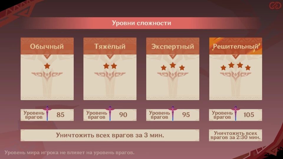 ㅤДля прохождения испытания на Решительном уровне сложности рекомендуется взять персонажей, способных нанести наибольший урон за короткое время. В противном случае, если противник успеет наложить Электро щит, помогут персонажи Крио, Дендро, и Пиро элементов, способные активно перемещаться по полю, чтобы избегать мощных атак.