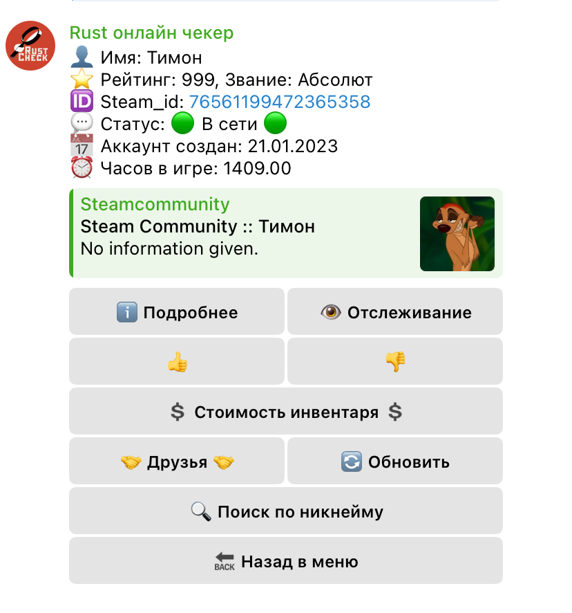 Rust — это динамичная игра выживания, где каждая деталь может сыграть решающую роль в вашем успехе. Чтобы не только выжить, но и процветать в этом суровом мире, необходимо использовать разнообразные инструменты и ресурсы. В этой статье мы рассмотрим лучшие инструменты, которые помогут вам стать более эффективным и успешным игроком в Rust. Выживание в Rust требует не только умения собирать ресурсы и строить базы, но и стратегического мышления, быстроты реакции и эффективного взаимодействия с другими игроками. Правильный выбор инструментов может значительно повысить ваши шансы на успех. Давайте рассмотрим, какие инструменты помогут вам достичь этого. Одним из самых полезных инструментов для современного игрока Rust является бот, предназначенный для мониторинга активности игроков. Его основное отличие от других подобных ботов, это расширенный функционал. Этот бот предоставляет следующие функции: 🟢 Отслеживание онлайн-статуса Вы будете получать уведомления при каждом изменении статуса игр