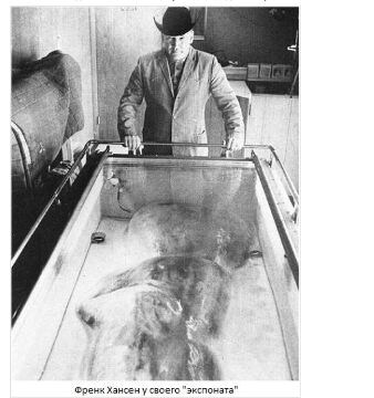 Посреди фургона стоял металлический ящик с крышкой из 4-слойного стекла. Внутри в глыбе прозрачного льда лежало тело, покрытое волосами в 7-10см. Рост – 180 см, голова запрокинута назад, левая рука над головой, правая – на животе. Ученые приходили в фургон ежедневно и часами просвечивали фонариками глыбу, рассматривали, измеряли, фотографировали.