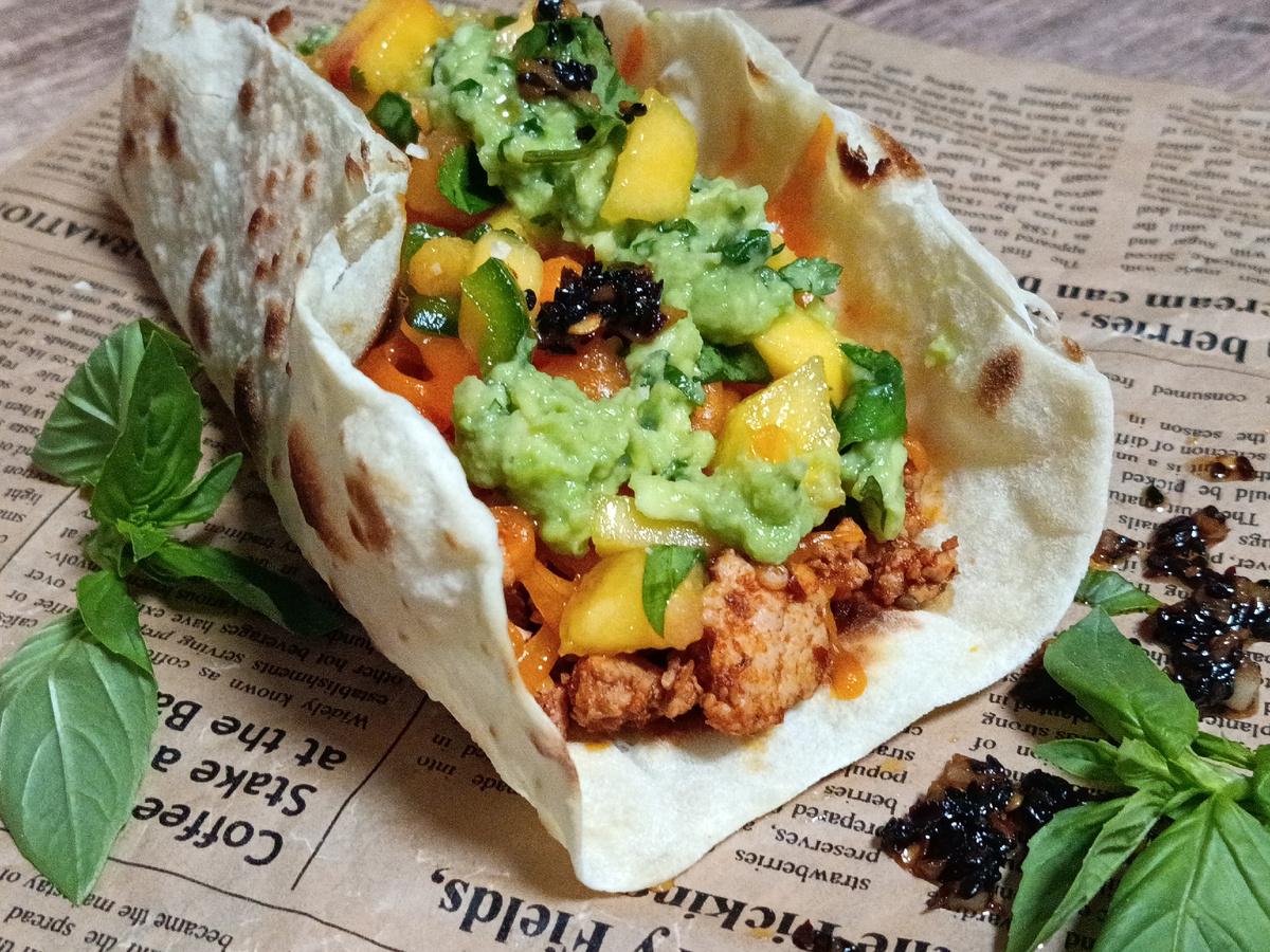 Вкусные, аппетитные куриные тако с чеддером, маринованным имбирем и хрустящими хлопьями чили. Насыщенный вкус куриного фарша с остротой хрустящих хлопьев чили и чеснока, пикантный сыр, кремовый авокадо, остра также нежный аромат маринованного имбиря создадут неповторимый вкусовой букет в каждом кусочке. А чтобы добавить нотку свежести и экзотики, добавим свежее манго, которое придает этому блюду неповторимый фруктово-сладкий вкус.