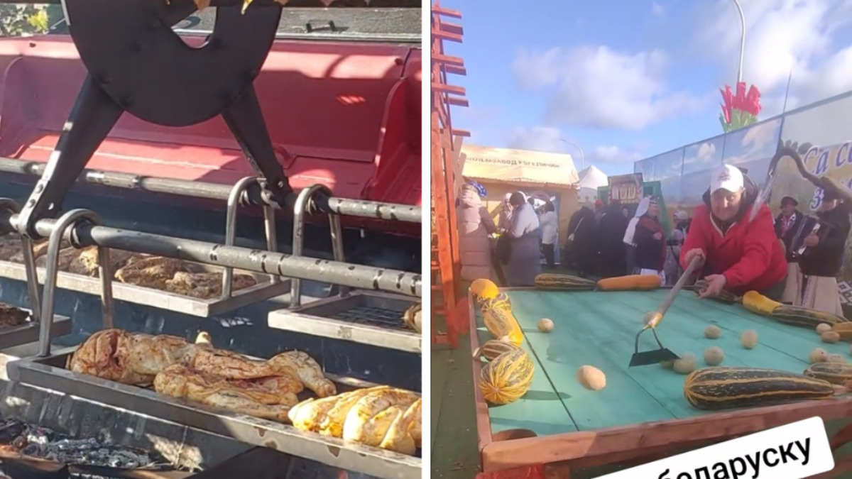 В городе Мосты Гродненской области в эту субботу, 2 ноября, провели фестиваль-ярмарку "Дажынкі-2024", на которой не только чествовали наиболее отличившихся во время уборочной кампании аграриев, но и развлекали гостей необычными активностями. Всем развлечениям организаторы ярмарки постарались придать аграрный флёр: шашлык решили жарить прямо на жатке комбайна, играть в шашки — мясными консервами, а в бильярд — картошкой и кабачками. Читайте также: "И вот тут начинается волшебство" - Белорусских водителей предупредили, что они "всю жизнь" заправлялись неправильно. Что ответили? Больше всего, судя по видео, разлетевшимся по соцсетям, гости ярмарки были впечатлены комбайном, который «модифицировали» под огромный мангал: колбаски, курочку и мясо разложили прямо на жатке, а снизу развели огонь. Запустив жатку в медленном режиме, удалось сразу приготовить большое количество мяса. Некоторые зрители усомнились в том, что таким образом можно как следует зажарить шашлык, однако автор ролика завер