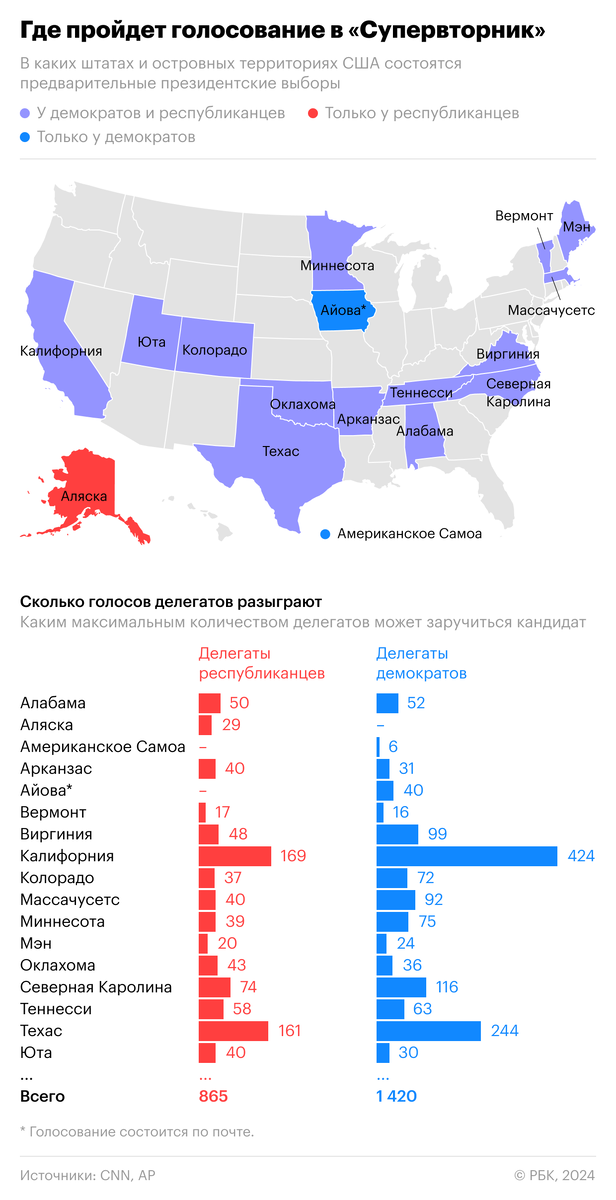 По итогам праймериз и кокусов определяется число партийных делегатов от каждого штата. Они будут голосовать за того или иного кандидата на партийных конвенциях (съездах), которые обе партии проведут летом. Для выдвижения в кандидаты от партии претенденту необходимо заручиться поддержкой более половины делегатов — это 1215 голосов для республиканцев и 1968 для демократов.