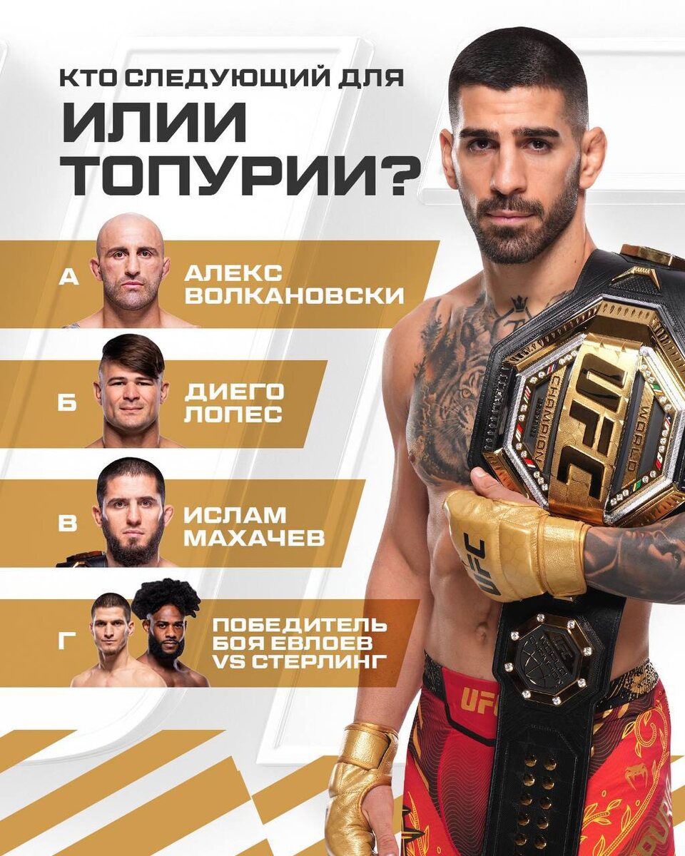Кто должен стать следующим соперником Ильи Топурии? 🤔 Алекс Волкановски - ♥️ Диего Лопес - 🔥 Ислам Махачев -