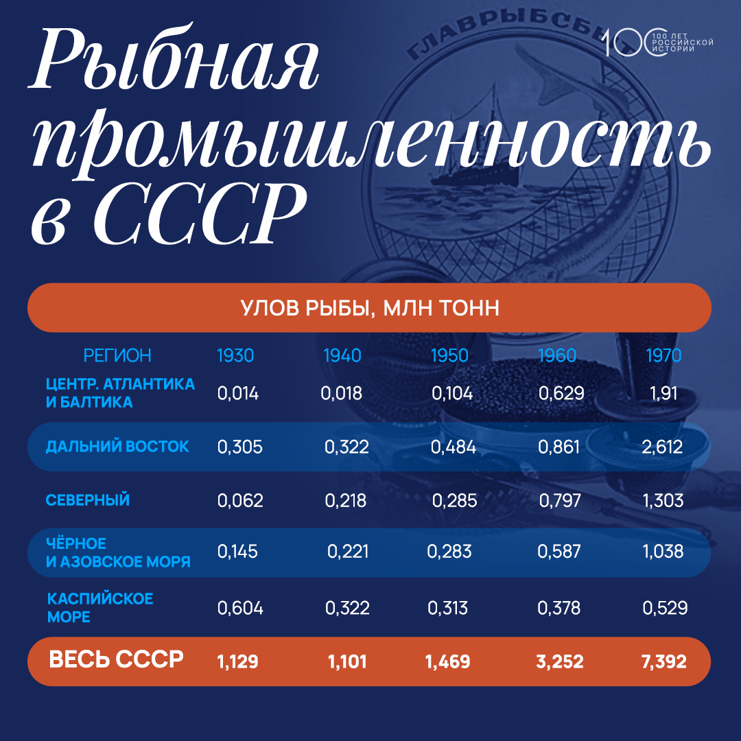 Рыбная промышленность играла важную роль в экономике СССР, обеспечивая продовольственную безопасность и экспортные доходы. Союз экспортировал значительное количество рыбы и рыбной продукции в страны Восточной Европы и Азии. Активно развивались системы как морского, так и пресноводного рыболовства. В инфографике рассмотрена динамика рыбного улова, потребления продуктов рыбпрома и масштабы рыбного экспорта.