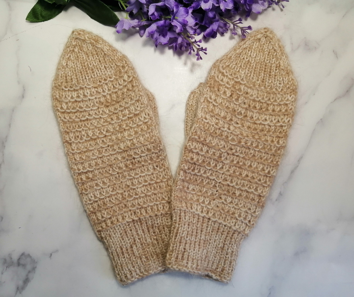 Добрый день, друзья! Начался сезон вязания варежек, шапочек и шарфов. Сегодня поделюсь обновкой. Связала теплые варежки спицами с универсальным узором. Вязала в 2 нити: одна нить - обычная носочная от Alize, вторая - пушистая с ангорой. Варежки получились теплые, ангора после стирки распушилась и закрыла все просветы между петельками. Нити разного цвета, поэтому получился меланж. Вязала полотно на спицах 3 мм. Вес варежек - 66 г (примерно 20 г - ангора и 46 г шерсть) Пряжа носочная молочного цвета Пряжа Alize Superwash comfort Метраж: 420 м на 100 г Состав: 75% шерсть, 25% полиамид Цвет 01 (молочный) Пушистая ниточка песочного цвета Пряжа YarnArt Angora de Luxe Метраж: 520 м на 100 г Состав: 70% мохер, 20% акрил Цвет 511 (песочный) На спицы 3 мм набрать 54 петли и вязать резинку 1х1 на высоту 20 рядов (по желанию). Далее по лицевой части переходим на узор, тыльную сторону вяжем лицевой гладью. На высоте 6 раппортов (7 см) от резинки делаем отверстие для пальца на тыльной стороне. Для
