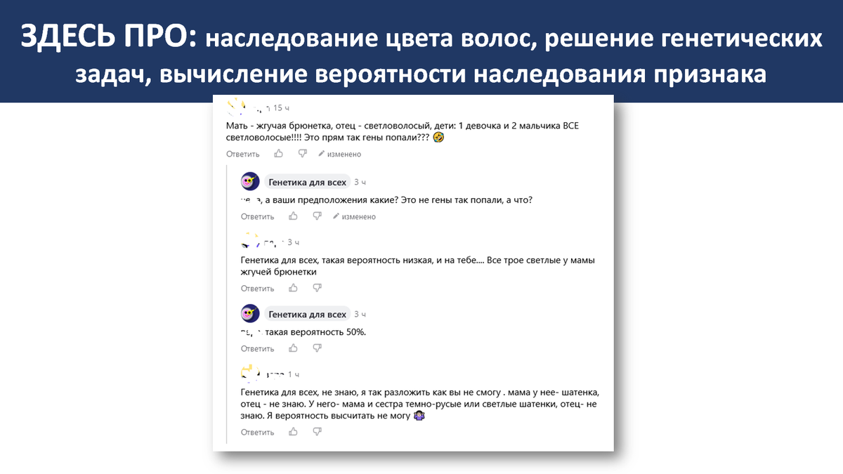 Комментатор: Мать - жгучая брюнетка, отец - светловолосый, дети: 1 девочка и 2 мальчика ВСЕ светловолосые!!!! Это прям так гены попали??🤣 Генетика для всех: ***, а ваши предположения какие? Это не гены так попали, а что? Комментатор: Генетика для всех, такая вероятность низкая, и на тебе.... Все трое светлые у мамы жгучей брюнетки Генетика для всех: ***, такая вероятность 50%. Комментатор: Генетика для всех, не знаю, я так разложить как вы не смогу . мама у нее- шатенка, отец - не знаю. У него- мама и сестра темно-русые или светлые шатенки, отец- не знаю. Я вероятность высчитать не могу 🤷🏻♀️? Рассмотрим как задачу эту ситуацию и определим вероятность рождения у данной пары светловолосого ребёнка. Напоминаю значение условных знаков при записи генетических задач: А – доминантный ген а – рецессивный ген Р – родители (от от латинского слова parenta – родители) Х - знак скрещивания G – знак, указывающий на гаметы, то есть на типы половых клеток, сперматозоидов и яйцеклеток, образ
