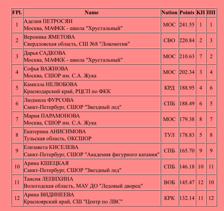 Завершились соревнования у женщин в рамках этапа Гран-при в Казани. Соревнования оставили самые приятные впечатления. Поговорим о произвольных программах. За этой фигуристкой слежу еще Ледникового периода Дети. Сегодня прокат был неплохим. У Маши очень высокие и сильные прыжки. Обидно за 1 грубую ошибку, бабочку на лутце. 2A+3T, 3Lz, 3Lo+2T, 3Lo, 3F, 1Lz+2A+2T, 3S. 119.73, 179.38, 7 место. Смогла собраться после неудачи в короткой программе и показала чистый прокат с 2 элементами ультра-си. 4T+2T, 4T с касание рукой льда, 3Lo, 3S, 3Lz+3T, 3Lz+2A, 2A, 3F Красивая программа. Эмоционально, глубоко и очень изящно. 149.39, 210.63, третье место. Открывала сильнейшую разминку. Фигуристка с очень длинными ногами, прямо статуэточка на льду. Со всеми элементам справилась: 3Lz, 3F+2T, 3F, 3Lo, 3Lz+2A+2T, 2A+3T, 3S. Выступала в образе «Шаманки». 126.99, 188.49, 6место. Интересный костюм у фигуристки. Хорошая программа, всю программу ехала на высокой скорости. Жаль, что не хватило сил на пр