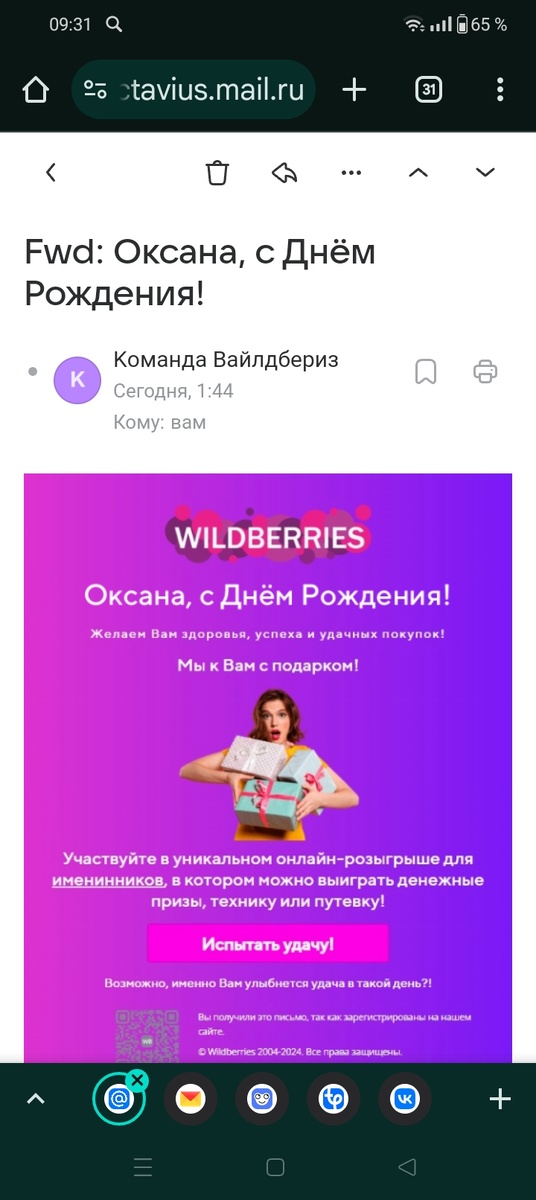 В день рождения получила "подарок" якобы от известного маркетплейса - на почту пришло письмо с таким содержанием 👇 Выглядело все очень по-настоящему. И даже я, которая в интернете работает и повидала кучу всего, купилась 🙈 Перешла по кнопке, вижу сайт одностраничник с "колесом удачи", точнее - с несколькими закрытыми сундучками. Дали 3 попытки выбрать тот, что с призом внутри. "Повезло" на 3 раз, азарт, кстати, затягивает как по сценарию. Хотите знать, что я выиграла? 257 000 руб. Да я богачка! И нет бы эти денежки мне сразу капнули на тот же кошелек Вайлдберриз 🥰 Но вылезло окно, куда надо вписать свои данные: ФИО и номер карты для перевода... А дальше, думаю, вы сами догадались что бы было. Не торопятся там отвечать, увы. На 3 день только написали, что это, действительно, мошенники. А то я не поняла 😜 Я то наивная надеялась, что маркетплейс хоть какую-то рассылку сделает клиентам или вывесит баннер на сайте, что они никаких розыгрышей не проводят, а под их именем действуют мошенн