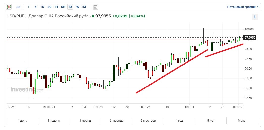 Однако если в первую половину осени рубль слабел чуть быстрее, то теперь, в последние пару недель начал слабеть чуть медленнее. Показал на дневном графике, как снижается его угол наклона.