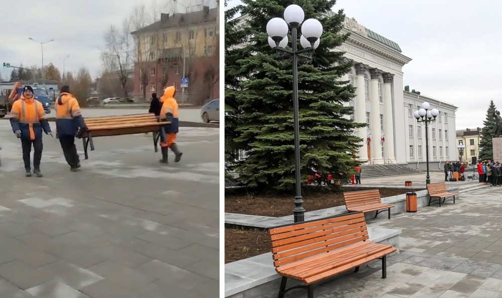 Появилось видео, как увозят скамейки и урны с только что открытой площади в Нижнем Тагиле