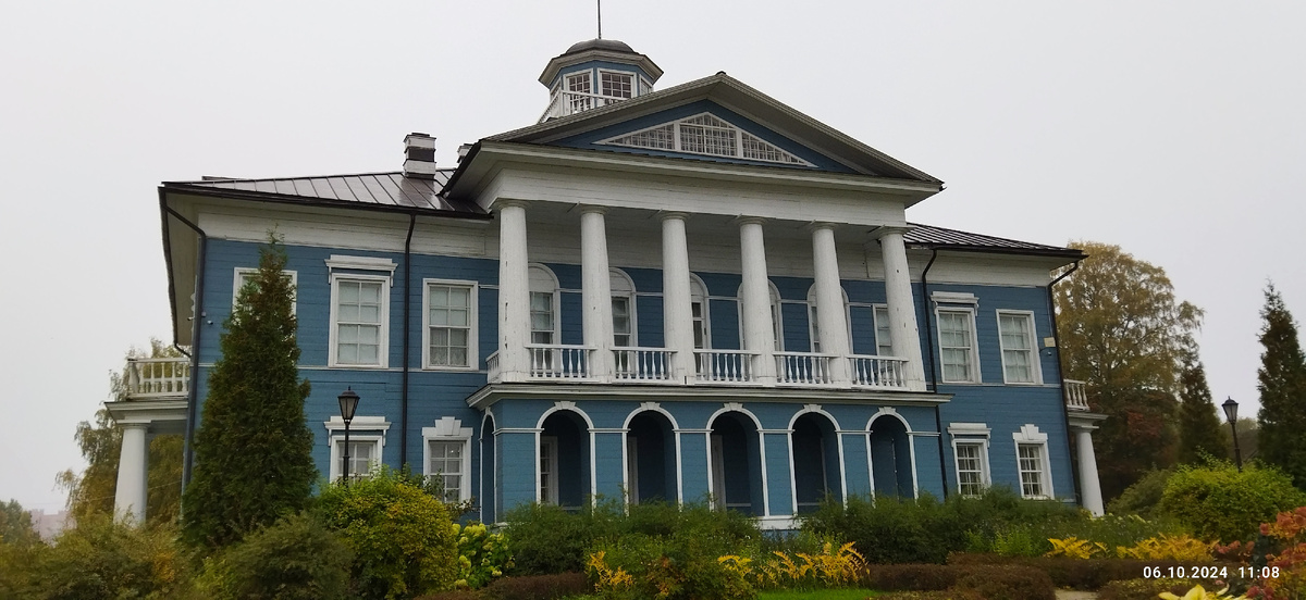 Это уникальный случай, что самая богатая дворянская усадьба начала 19 века со всеми многочисленными постройками и парком находится прямо в городской среде. Хоть и на другой стороне реки Шексны, но в южной части самого города Череповца. И добраться до усадьбы легко на разных видах транспорта. От ж/д вокзала ходят автобусы. Главным фасадом величественный двухэтажный барский дом выходит на реку и просматривается с набережной. Дом в бело-голубых тонах построен в стиле классицизм из лиственницы. Посетители заходят в дом с дворового фасада, который смотрится не менее красиво. И перед дворовым фасадом располагаются разные постройки, входящие в состав усадьбы: дом управляющего, две людские избы, конюшня, амбары, шорная мастерская, маслобойня, кузня. Прежде чем зайти в музей «Усадьба Гальских», я решила походить вокруг, полюбоваться природой. Осенью все выглядело особенно живописно, у меня уже есть статья о моих осенних впечатлениях. Не могла не обратить внимание на конюшню и на лошадок, на кот