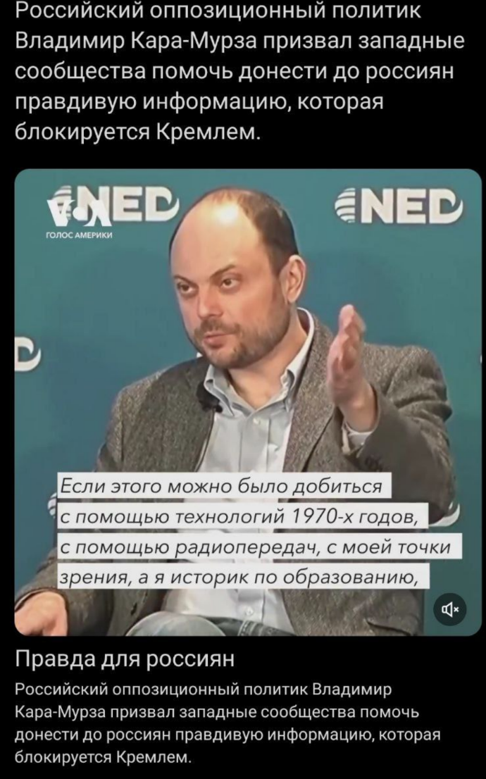 Вот Кара-Мурза сам с диагнозом, как его адвокат говорил, и думает, что все такие. Какую правдивую информацию он собрался до нас доносить? Опять про сливочное масло заведется? Ну так мы в курсе, что с ним какие-то сложности, лично мне для этого западные сообщества без надобности. Но Владимир без этих сообществ не справляется. Его, очевидно, не слушают, и он желает, чтобы ему помогли. Понятно же, что сами россияне правдивую информацию узнать не могут, так как она известна только западным сообществам. Ибо это тайна, которую должны знать не все. А почему, кстати, Кара-Мурза, гражданин Британии, называет себя РОССИЙСКИМ оппозиционным политиком? Какое отношение он имеет к России - особенно учитывая, что он даже не в состоянии без западной помощи "донести" до нас правдивую информацию? Это, если я правильно понимаю, Каора-Мурза желает, чтобы мы тут, спрятавшись в ванной, слушали "Голос Америки"? Пусть его братья слушают. Нам он совершенно без надобности. У нас свои любимые авторы! Знаете, я