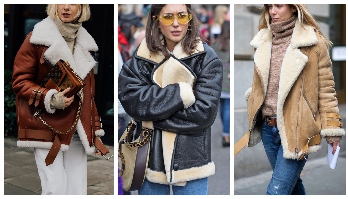 В течение многих лет дубленка авиатор занимает лидирующие позиции в мире моды. Некоторые любят ее за удобство, другие за универсальность, а есть те, кто влюблен в ее внешний вид. Сейчас мы рассмотрим, с чем стилисты предлагают носить эту объемную дубленку повседневно. Образ с объемной дубленкой авиатор с контрастной фурнитурой отлично сочетается с кожаными брюками, белой минималистичной футболкой и базовой сумкой из натуральной кожи. Черная дубленка свободного фасона в этом аутфите гармонично перекликается с оверсайз вязаным свитером, мини черной юбкой из плотного трикотажа, а также эффектными замшевыми ботфортами. Изумрудная дубленка с белым мехом + трикотажный лонгслив молочного цвета в мелкий рубчик + светлые вельветовые брюки + принтованный атласный платок — удачный образ на каждый день, когда настроение нарядиться поярче. Удлиненная коричневая дубленка с белоснежным мехом гармонично смотрится с белыми брюками и водолазкой песочного цвета. В холодную погоду отличным вариантом для