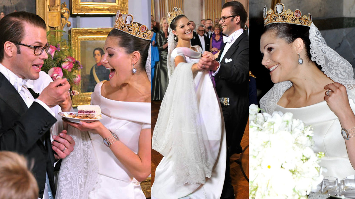 Платье принцессы Виктории из шелка дюшес цвета слоновой кости от Pär Engsheden в сочетании с диадемой ее матери, напоминающей корону, придало гламурный блеск и без того эффектному событию. Пятиметровый шлейф из шелка был убран для свадебного банкета пары в Королевском дворце, где после первого поцелуя на историческом балконе они вальсировали как принц и принцесса, герцог и герцогиня Вэстергётландские.