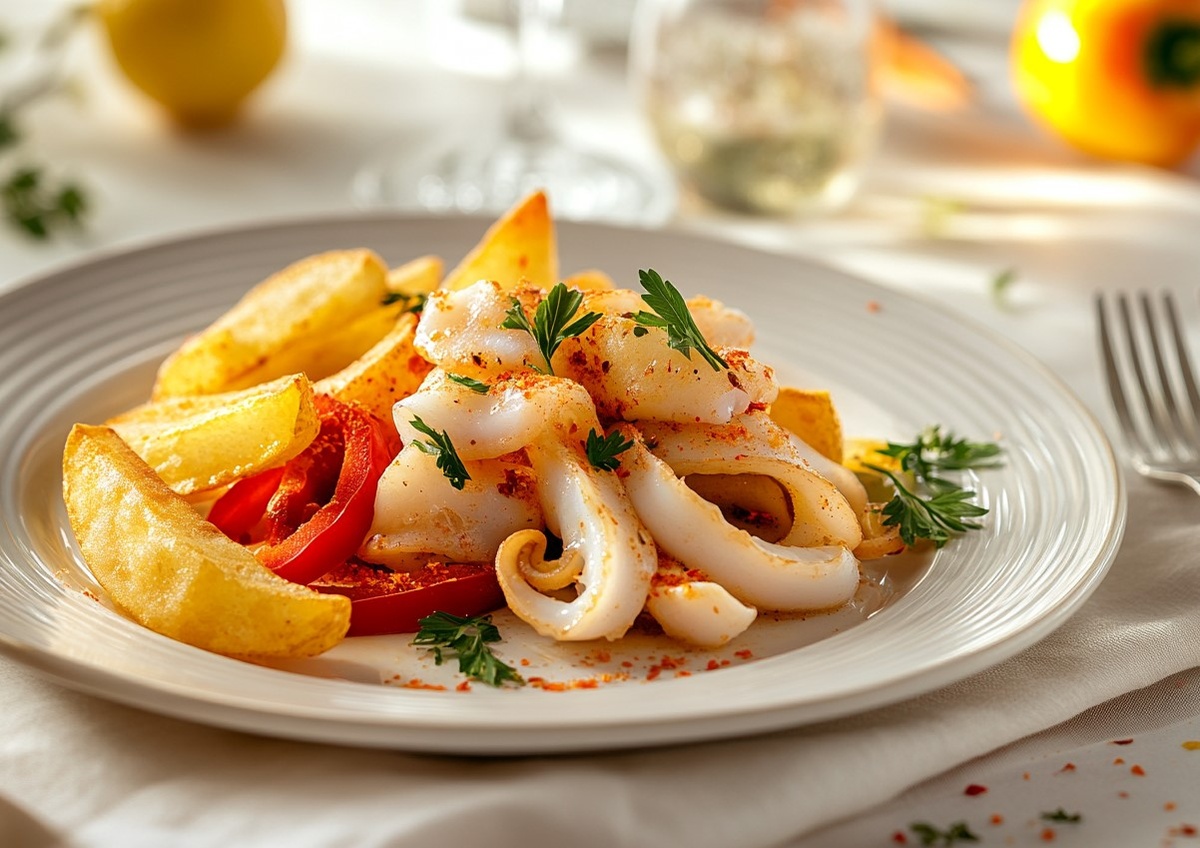 Кальмары с жареной картошкой и болгарским перцем – это вкусное и быстрое блюдо сочетает в себе нежность кальмаров, хрустящий картофель и сладость болгарского перца, прекрасный выбор для семейного ужина. Кальмары с картошкой жареные на сковороде получаются очень нежными, сочными. Кальмары (очищенные) — 400 г Картофель — 500 г Болгарский перец (красный или жёлтый) — 2 шт. Лук репчатый — 1 шт. Чеснок — 2 зубчика Оливковое или растительное масло — 3 ст. л. Соль — по вкусу Перец чёрный молотый — по вкусу Паприка молотая — 1 ч. л. Свежая петрушка — для подачи Кальмары с жареной картошкой готовы. Приятного аппетита! Подписывайтесь на канал "Вкусно Очень" Данный рецепт на сайте👇