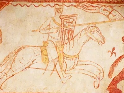 Всадник-тамплиер, вступающий в бой, фрагмент фрески в часовне тамплиеров в Крессаке, Франция.
