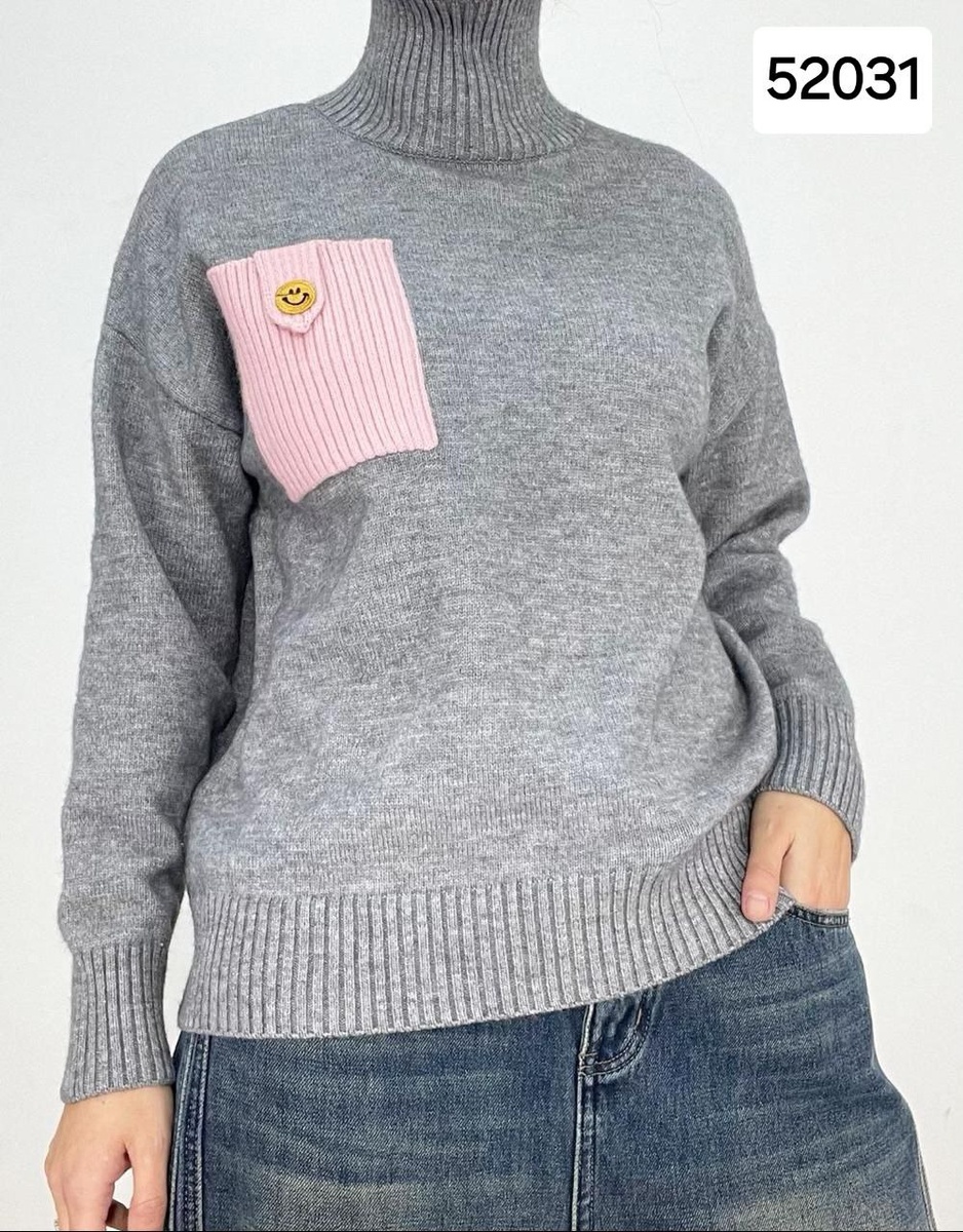 Например, такой свитер, я вижу впервые. Вообще, я карманы и разные нашивки люблю. Но этот карман мне кажется (говорю осторожно, эпитетами не разбрасываюсь), не очень в тему, и он слишком выделяется. Пуговка со смайликом прикольная, возможно свитерок подойдёт для веселого настроения )))