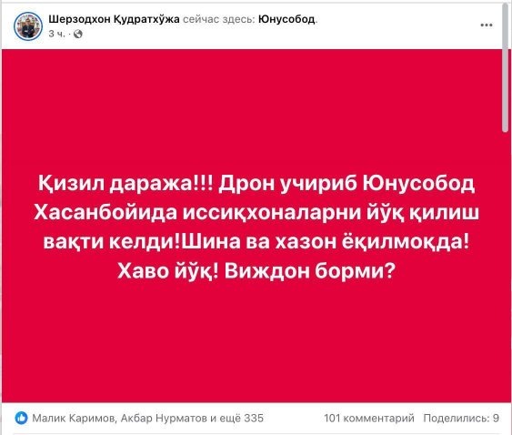 «Красный уровень опасности!!! Настало время навести порядок в тепличных хозяйствах Юнусабада и Хасанбоя с помощью дронов! Жгут шины и опавшие листья, воздуха нет! Где ваша совесть?», — написал он в своём посте.