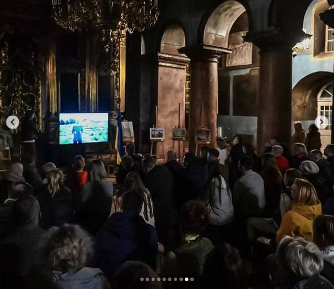 Помещение храма заполнили стульями и пригласили зрителей. По бокам экрана расставили картины с видами Чернигова.